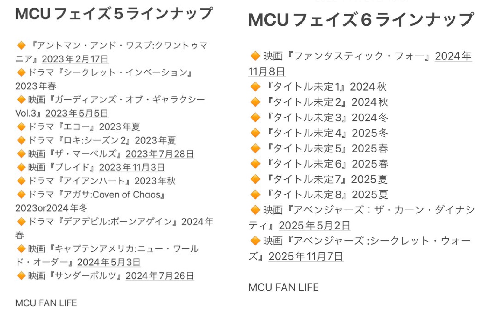 デッドプール3、シャン・チー2、アーマー・ウォーズ、ホワット・イフ…?(シーズン3)、X-MEN'97(シーズン2)、スパイダーマン:ソフォモア・イヤー、アイアムグルート(シーズン2)が製作決定済みそういやモンスターバース新作、ヴェノム3、プレデターシリーズ最新作、トランスフォーマー新作、ギャラファイ4、ファンタビ4、スパイダーマン4、デップー3はいつになるんだろうか