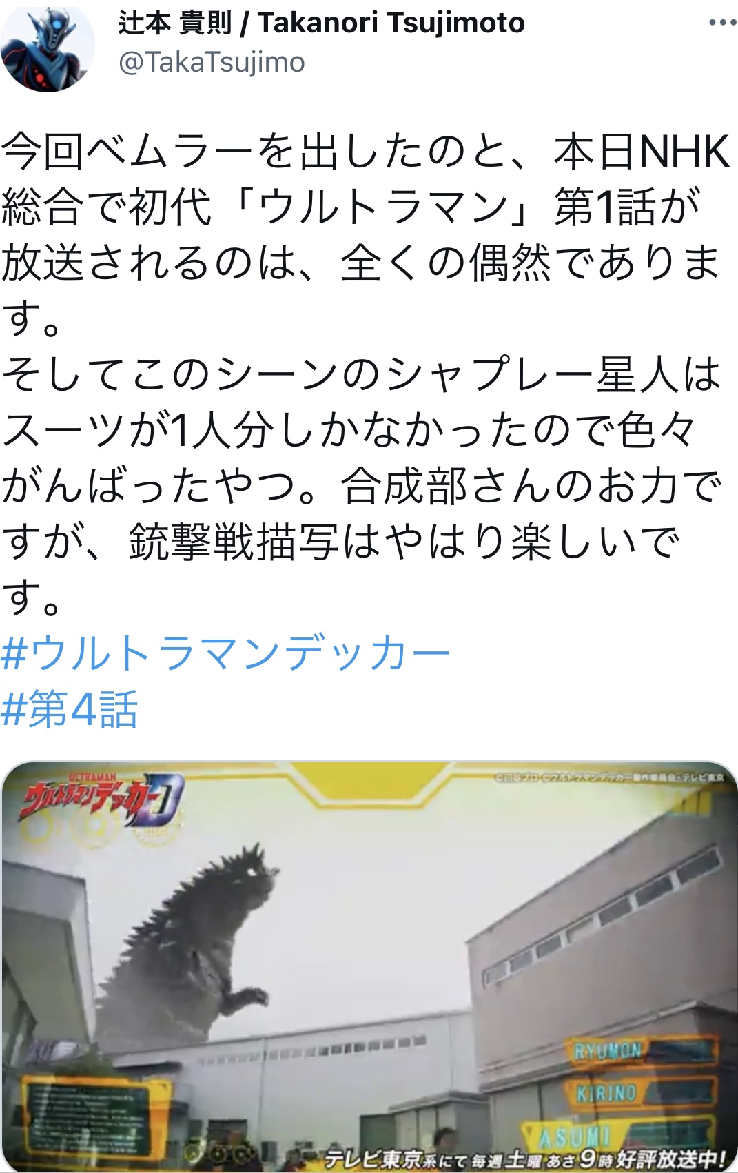今回のデッカーにベムラー出たのと今日のNHK総合で初代「ウルトラマン」第1話が放送されるのは偶然とはこれはウルトラ凄い奇跡よむしろベリアル 陛下は色々怪獣形態になられるから正直怪獣の方がしっくりくる