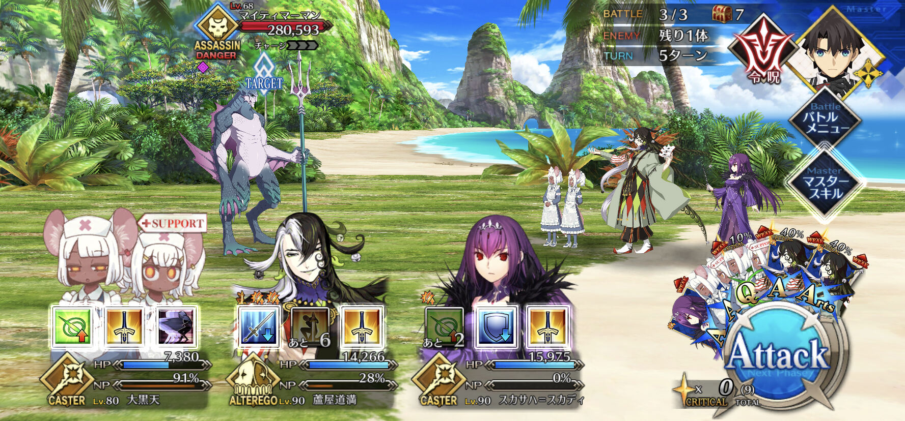 そしてですね、ここまででお分かりいただけましたでしょうか、必須の強いサポーターなどが居ないことを。つまり、フレスキルマ鯖のあんなメンツやこんなメンツのことを考えなくていいんです。武蔵ちゃんと共に戦える。ここもポイントだと思います。自前でサポーターがいるならそれでもいい。今はいろんなバスターサポーターがいますし、バスターじゃなくてもいろんなサポーターが実装されました。ちなみに私はマシュを使いました!クリティカル抑えるいうても普通にデカいダメージ入るからね!