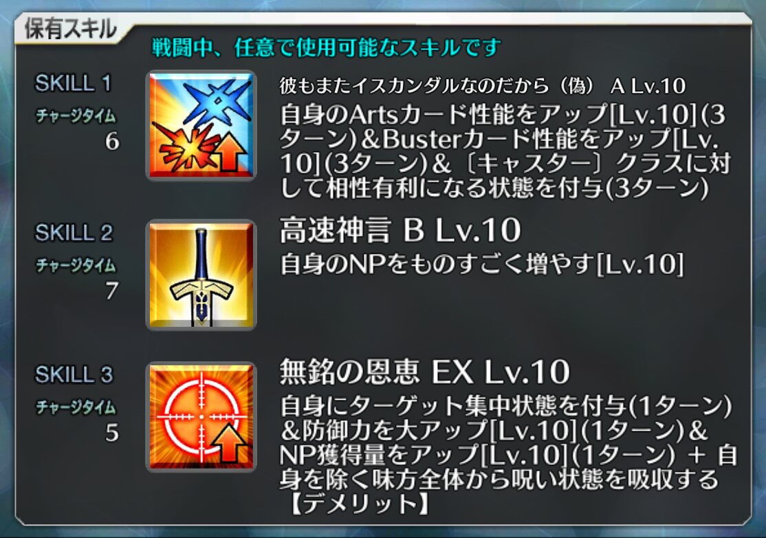 LB4のアルジュナ戦で見事なアシスト決めてくれた時から敬ってたけど、宝具強化で手に入れたNP獲得量アップとOCアップが思いの外便利で倍敬うようになった>>98