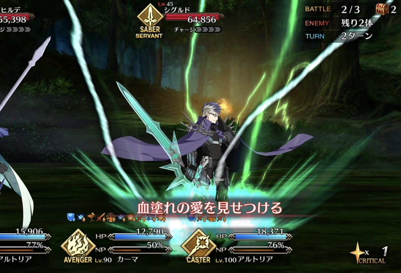 2ターン目 先生タゲ集中+ガッツ 令呪装填 クリームヒルト 令呪装填 先生宝具→クリームヒルト宝具 コマンドカードがクリームヒルトのアーツがあればアーツを選択
