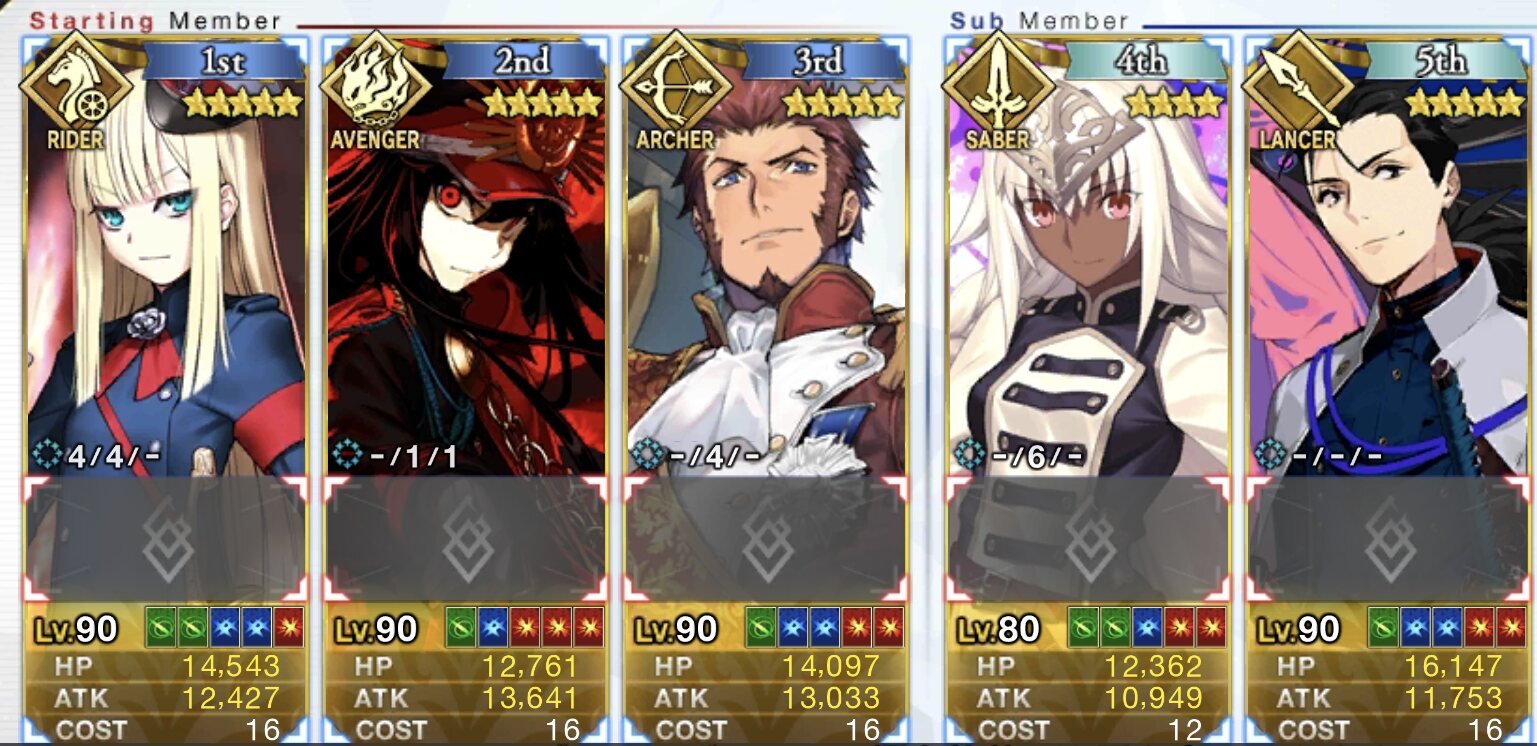 あとはクリームヒルトの宝具を回したいのでサポートはNPチャージやアーツバフができる鯖がいいかと(低レアだとアンデルセンやパラケルスス辺り?)