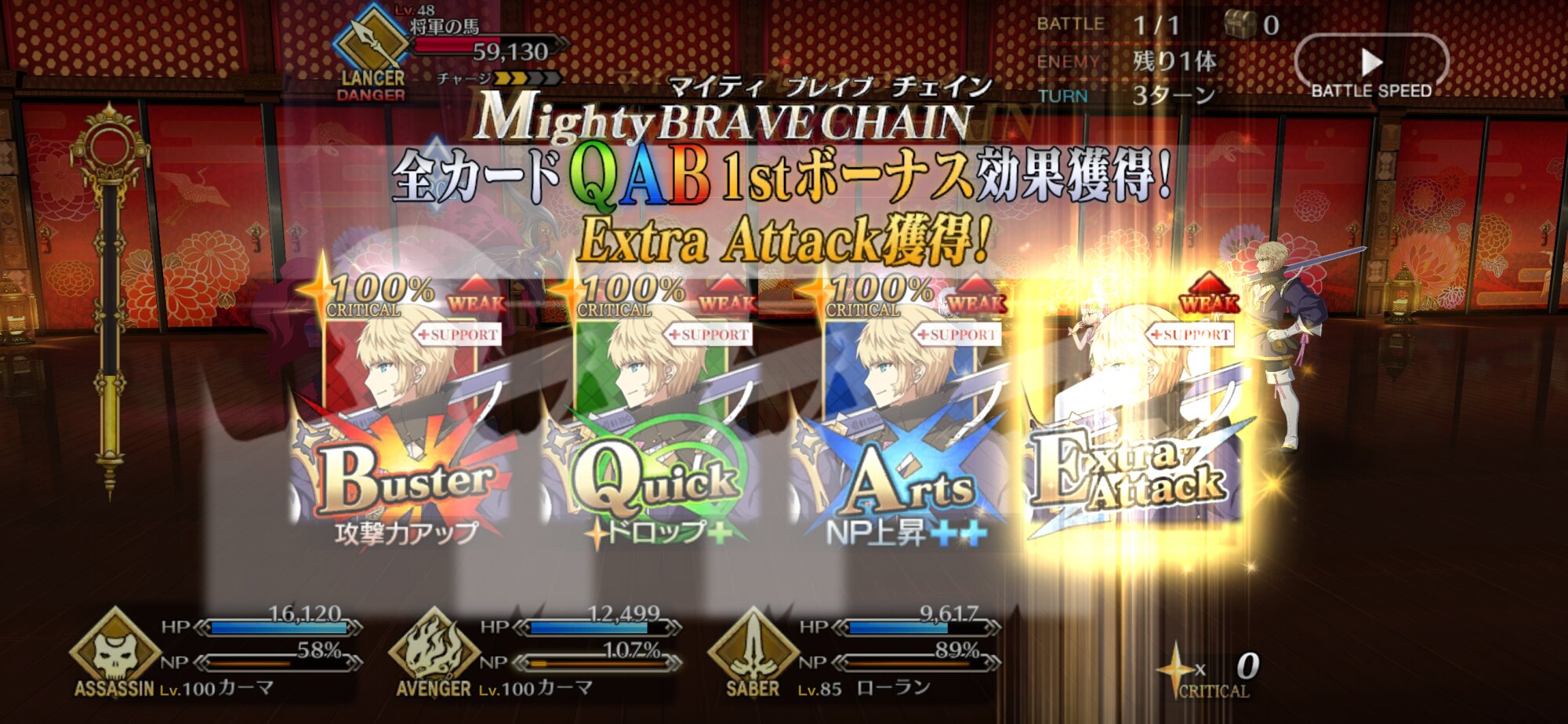 始動宝具で他のカードがクリティカルしやすくなって、マイティチェインをすればA始動と同じNP効率で攻撃出来るようになる
