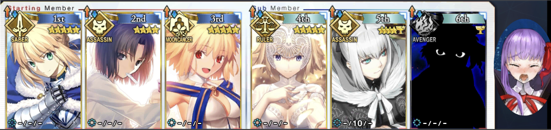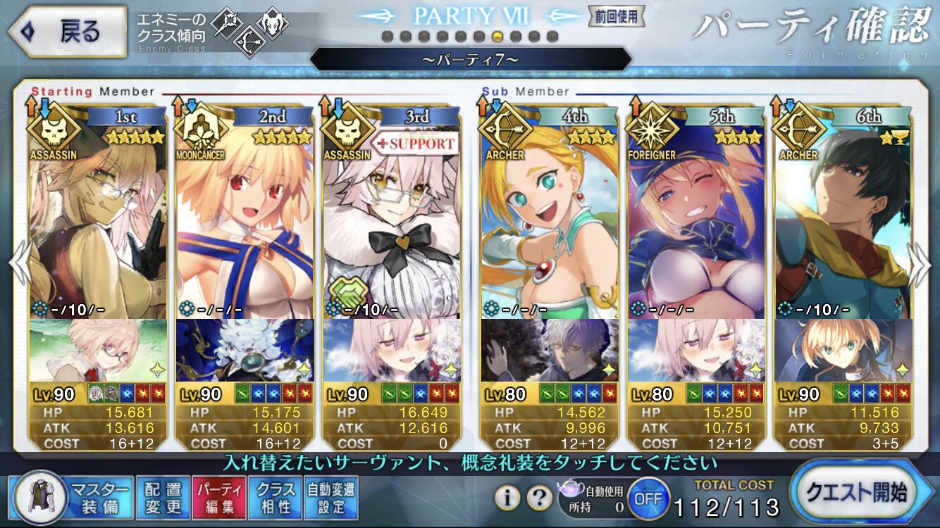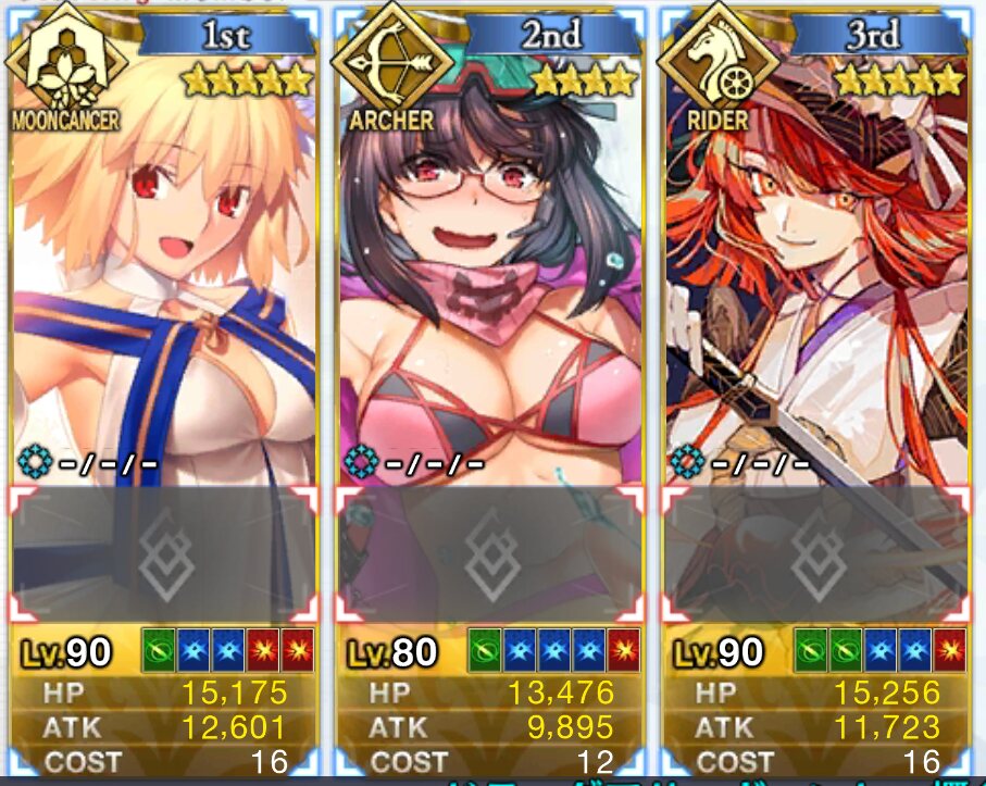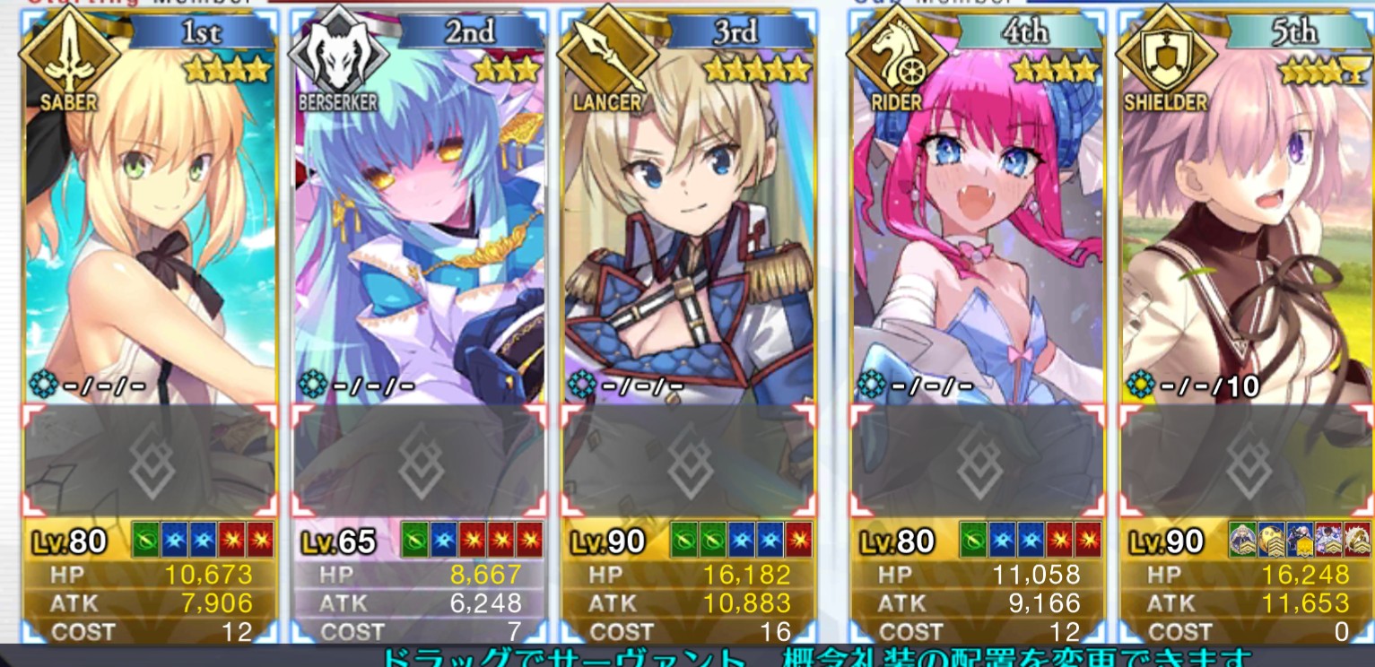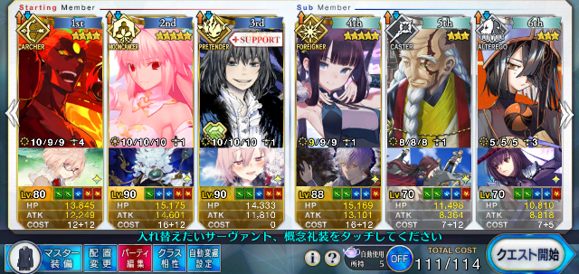 ↓これはつい最近の歯車ハントで使った編成なのだが(メリュジーヌもアペンド2解放してます)、アペンド2を開けることで、モルガンスキル2のNP20をメリュジーヌに回すことができて、宝具が打てる。