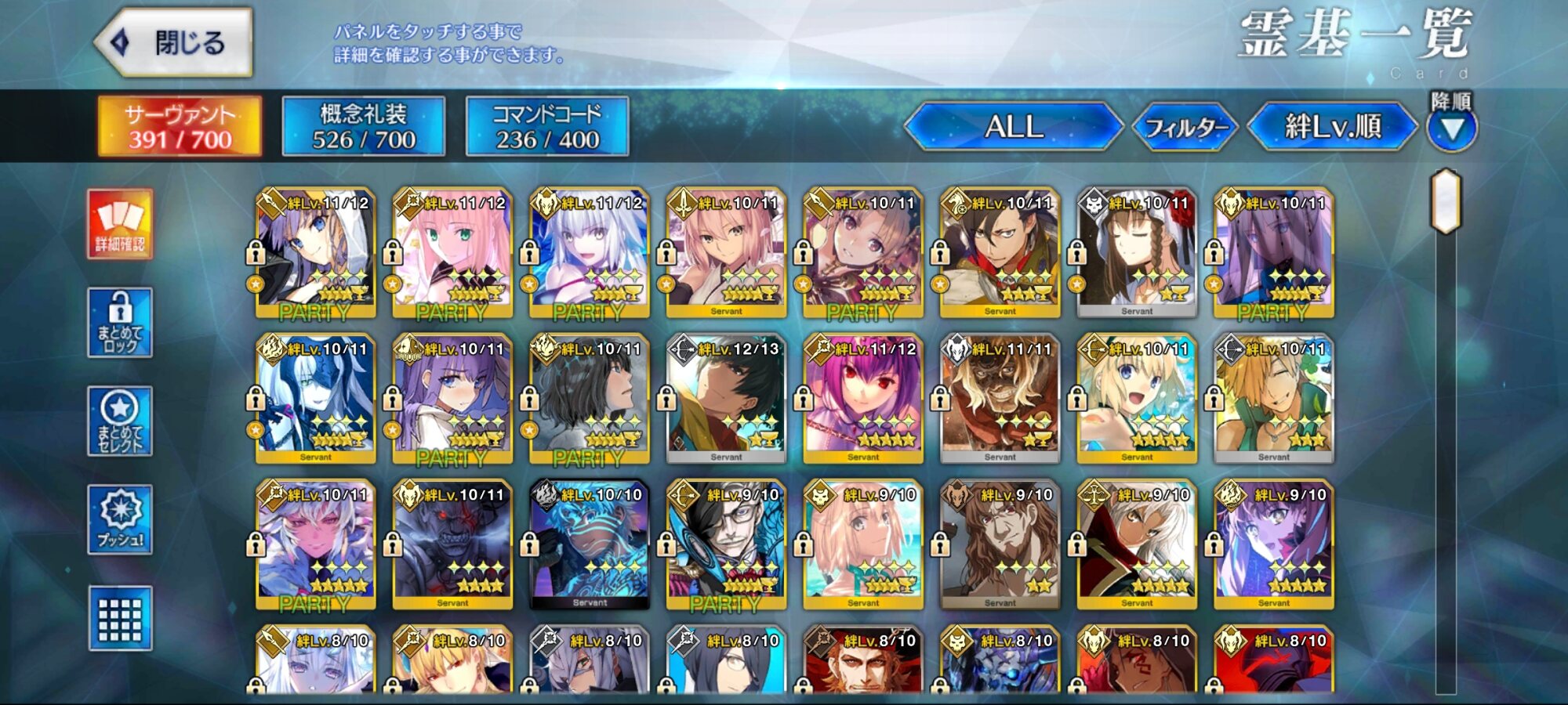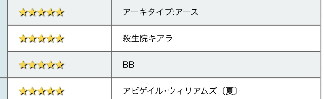 でも青空もいいですねえ!マシュが最初に焦がれたものを運命と出会ったことで見ることができましたもんねえ低レアで周回に使ったり後衛に入れたりして9くらいまで上がってる鯖がかなりいるけど、10にしちゃうと絆もったいなくてちょっと使いにくくなるんだよな