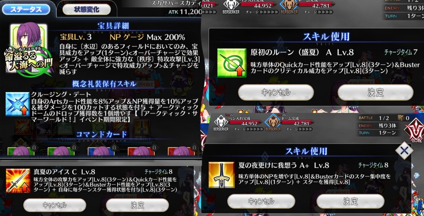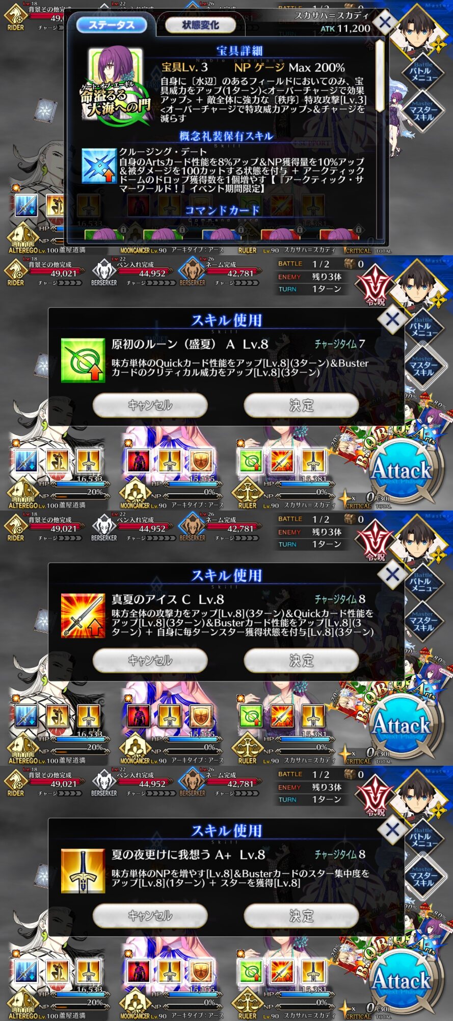 今年は天草も参加するらしいからハロウィン決着編がさすがに見られるんだろうがふーむ、Q性能アップがルーンで同値なら、全体分で上回るし、スカディと水着スカディで今までのスカスカはサポートに寄らず使えそうかねえ。攻撃上昇も入るし
