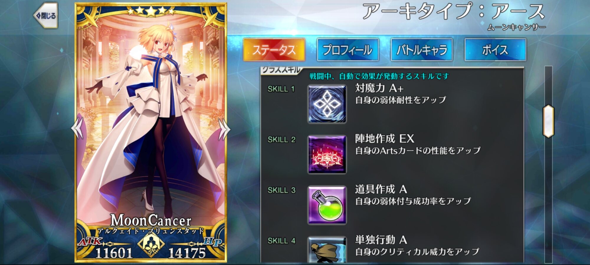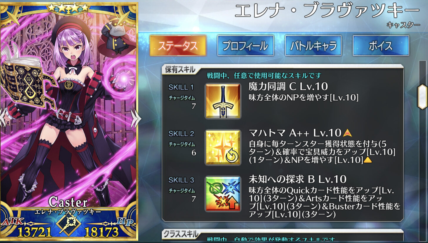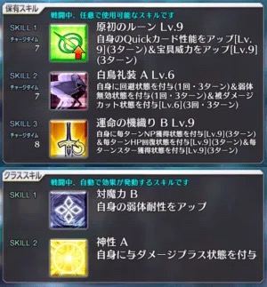自分の宝具威力を一ターンアップ(オーバーチャージで効果アップ)、『敵全体に死霊特性付与』&強力な人の力を持つ敵特攻&三ターン防御力ダウン