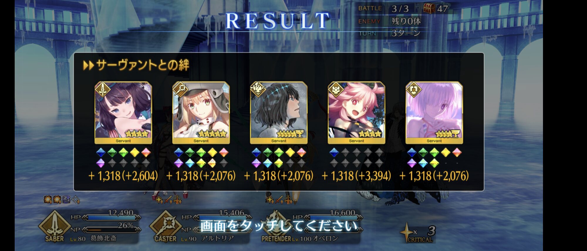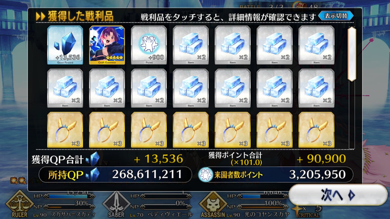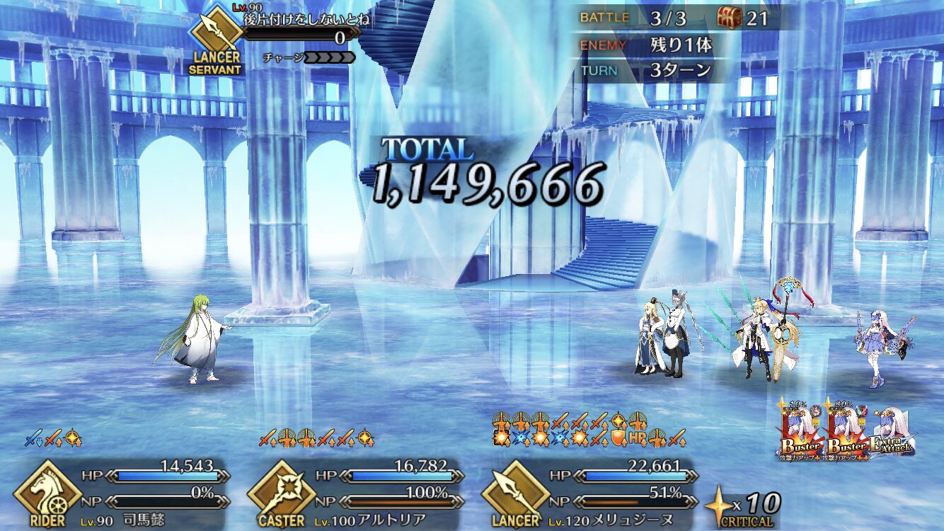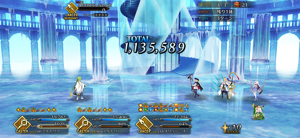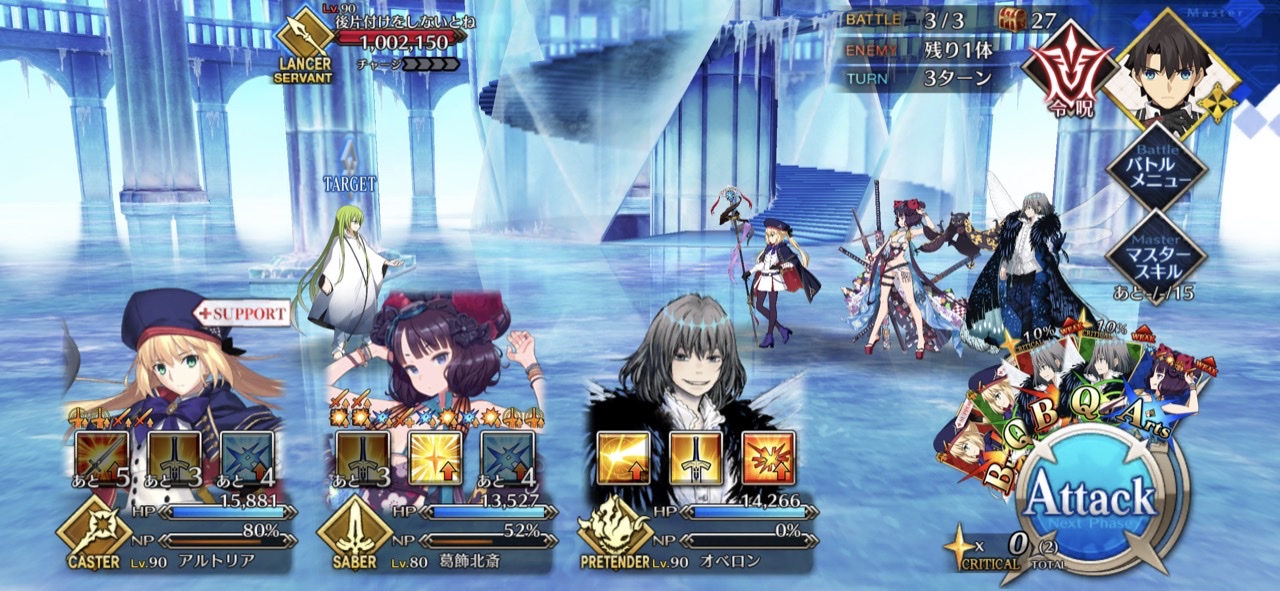 2wave目はキャストリアのNP効率アップ1つかけて、キャストリア2体のどちらかの第一スキルでNP供給、一ちゃんの宝具で2wave目のマハー・ナーガ倒して2wave目終了
