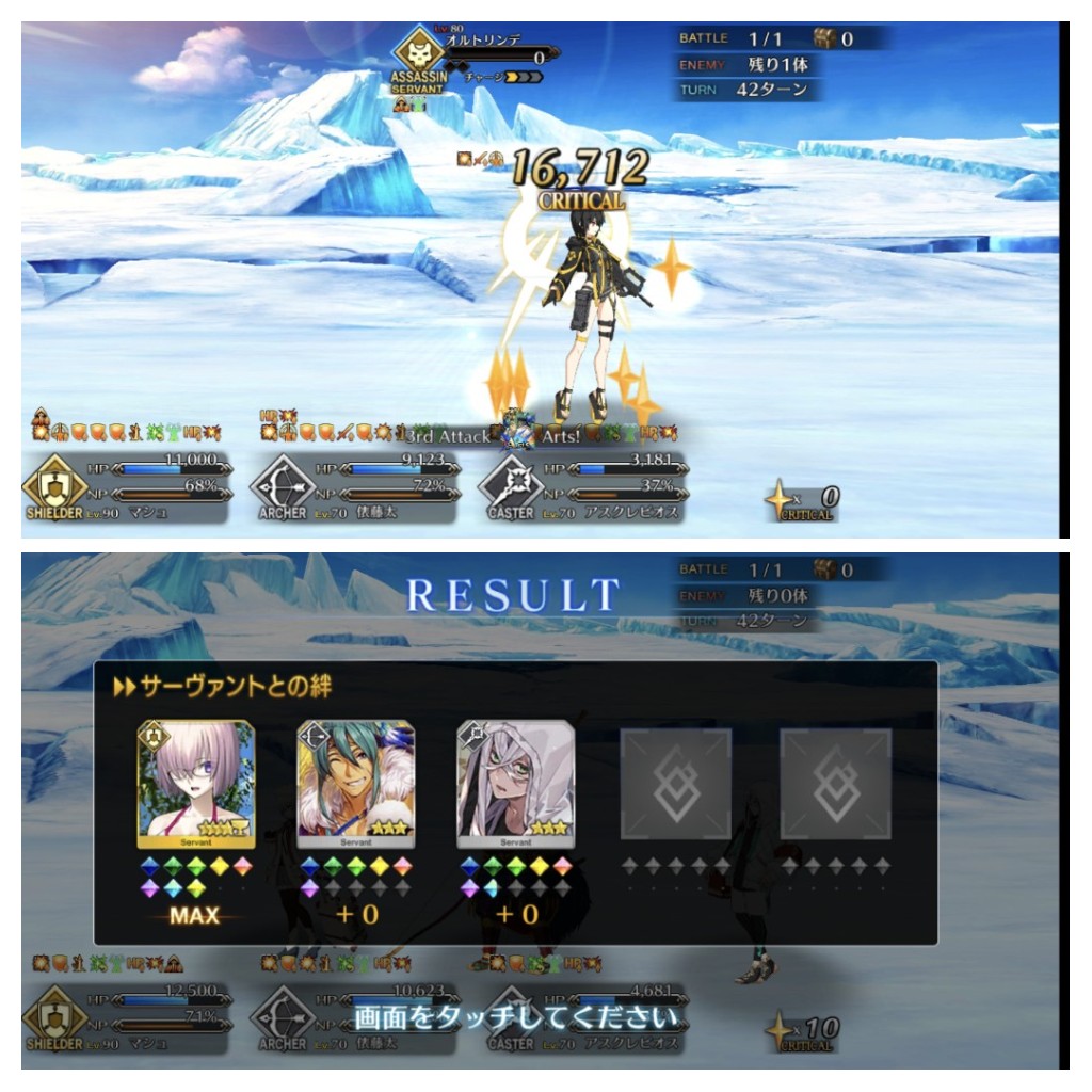 1ターン目でアスクレピオスの全スキル使用で一ちゃんにバフを盛って、オダチェンでフレのキャストリアと交代。Arts強化2つとNP効率アップ1つかけて一ちゃんで宝具で1wave目終了
