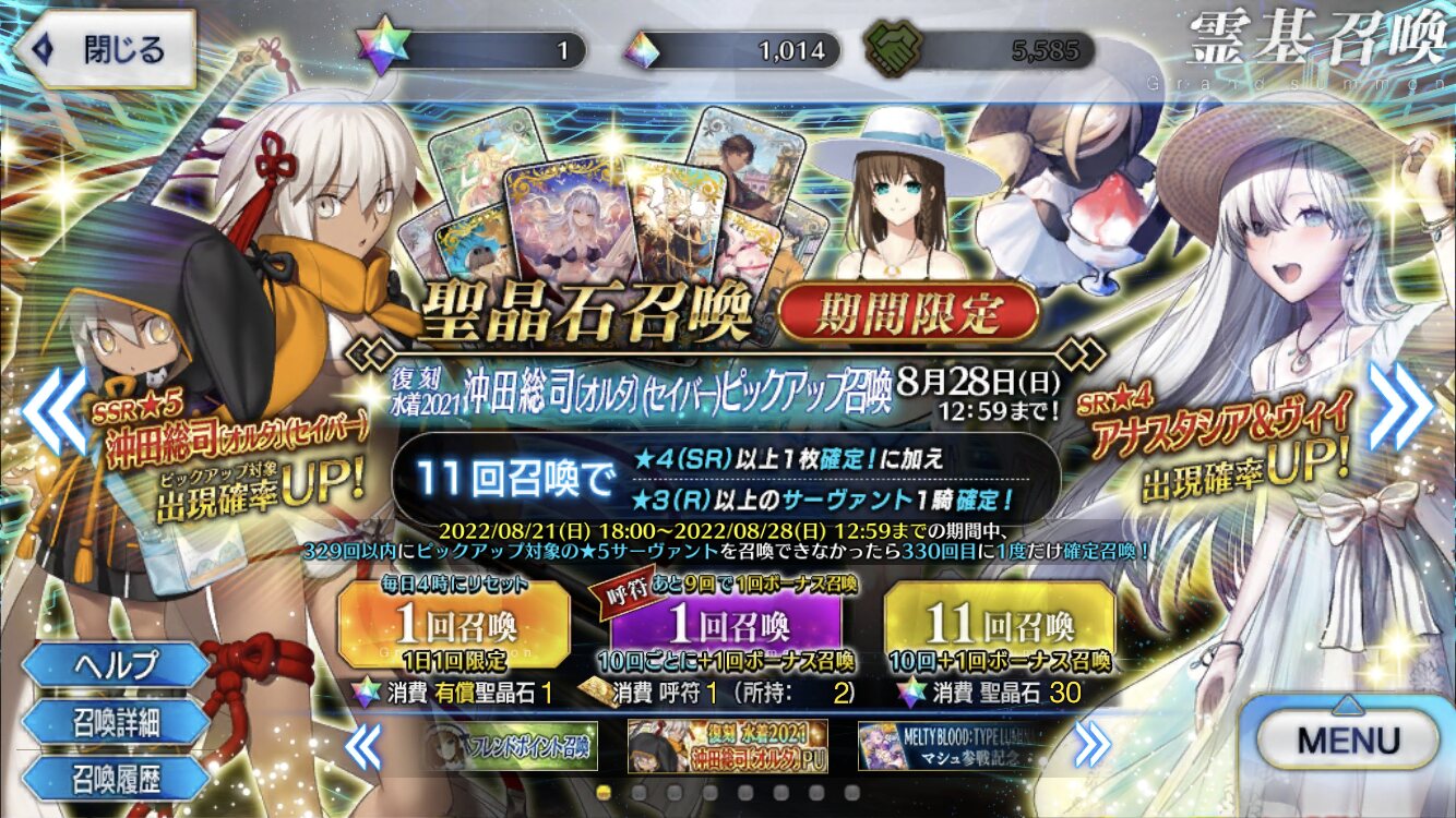 去年の水着ガチャ来てしまったああもう石ないよおお復刻水着イベなしが確定したね