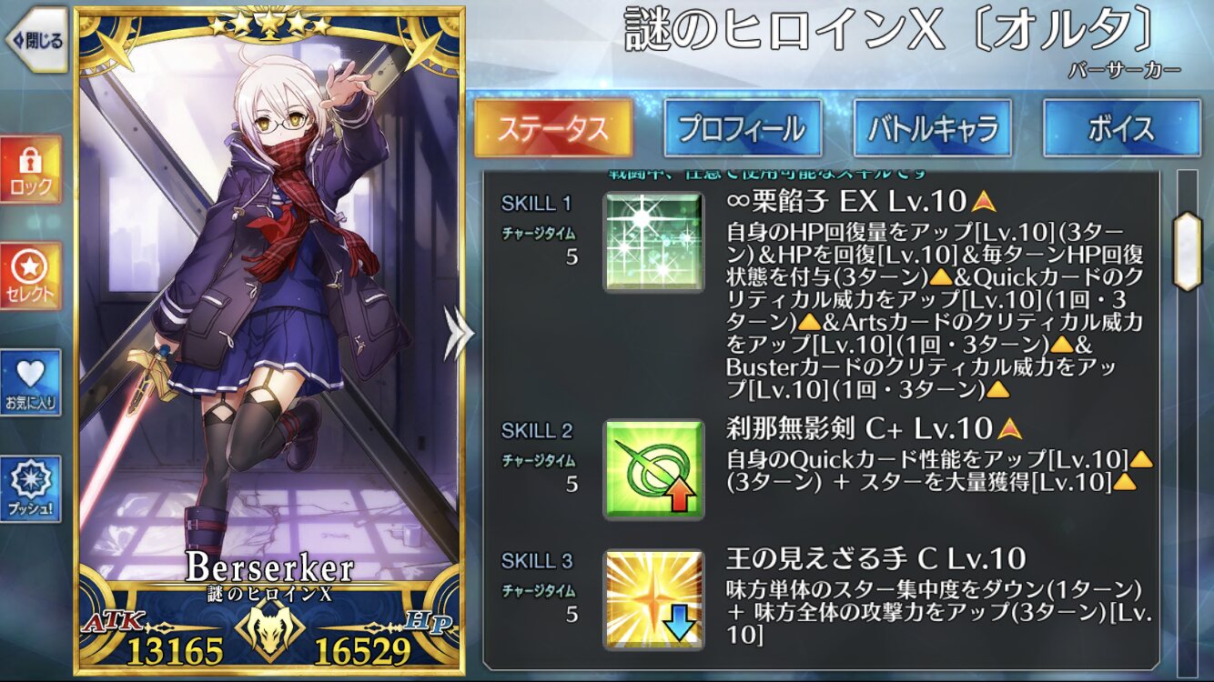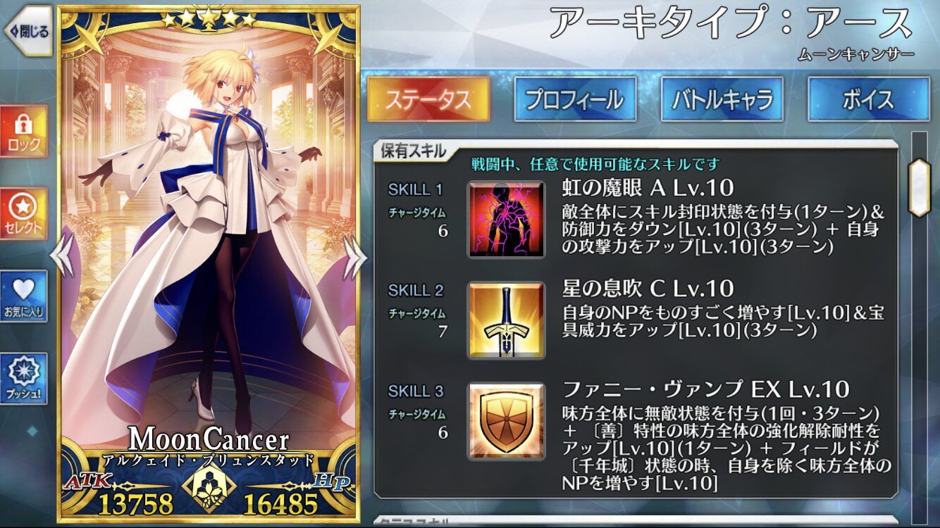 うちのベティはクリア前に宝具5だったなあ・・・全体チャージに各種回復、ガッツにリジェネとなんでもござれだが撃たれ弱いのが難点のアスクレピオス