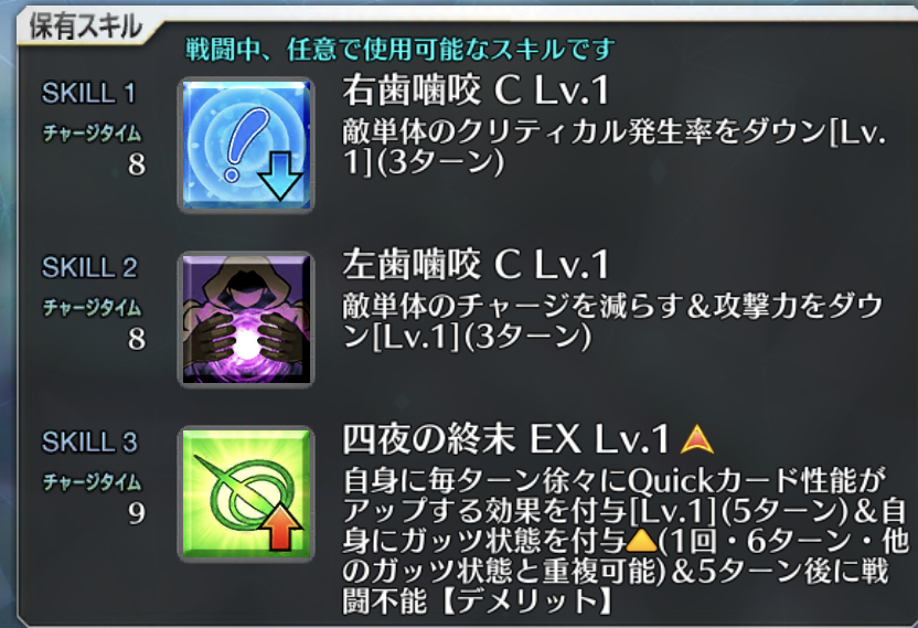 スキル1『原初のルーン(盛夏)』味方単体のQ性能を3Tアップ+Bのクリ威力を3Tアップ。従来のスカディバフとは違いBのクリ威力を上げるから注意なさい