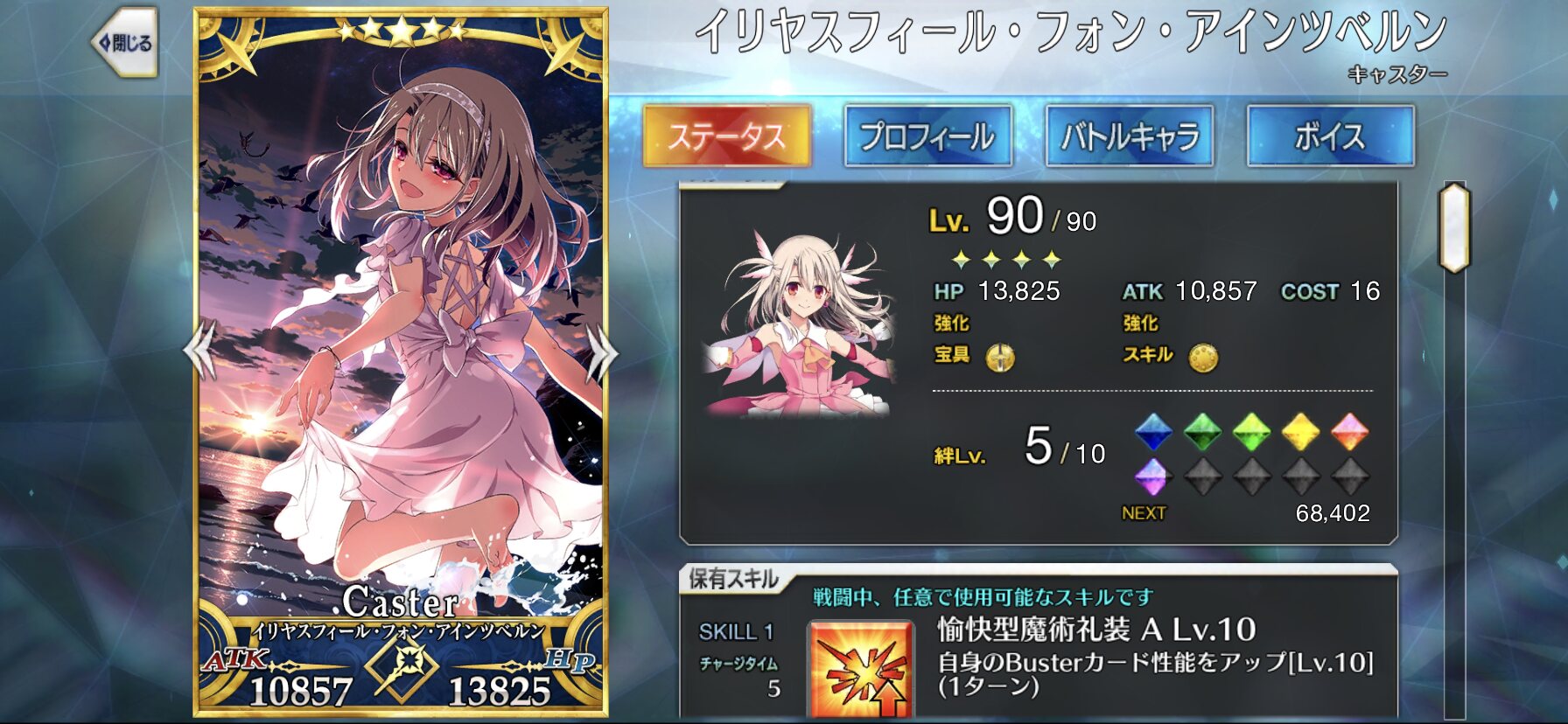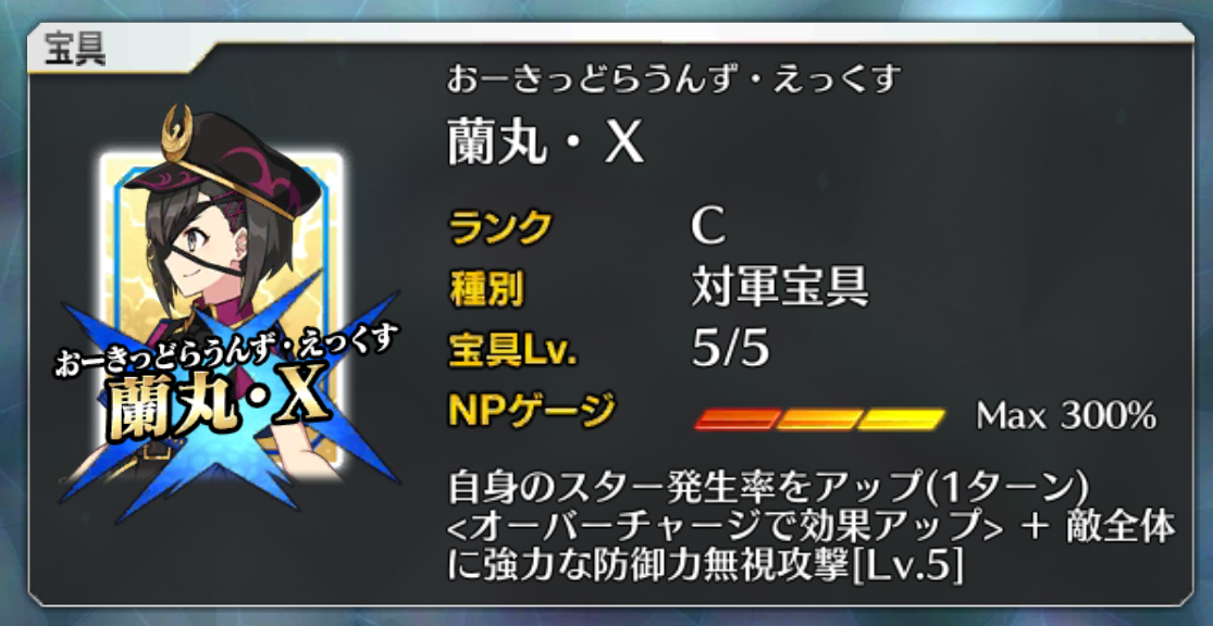 スキル3『夏の夜更けに我想う』味方単体にNPチャージ+Bの星集中率を1Tアップ+星獲得。最大で50NPとバーサーカーでも吸えるレベルの星集中に15個の星を渡すという至れり尽くせりのスキル。最優先で強化したいわ