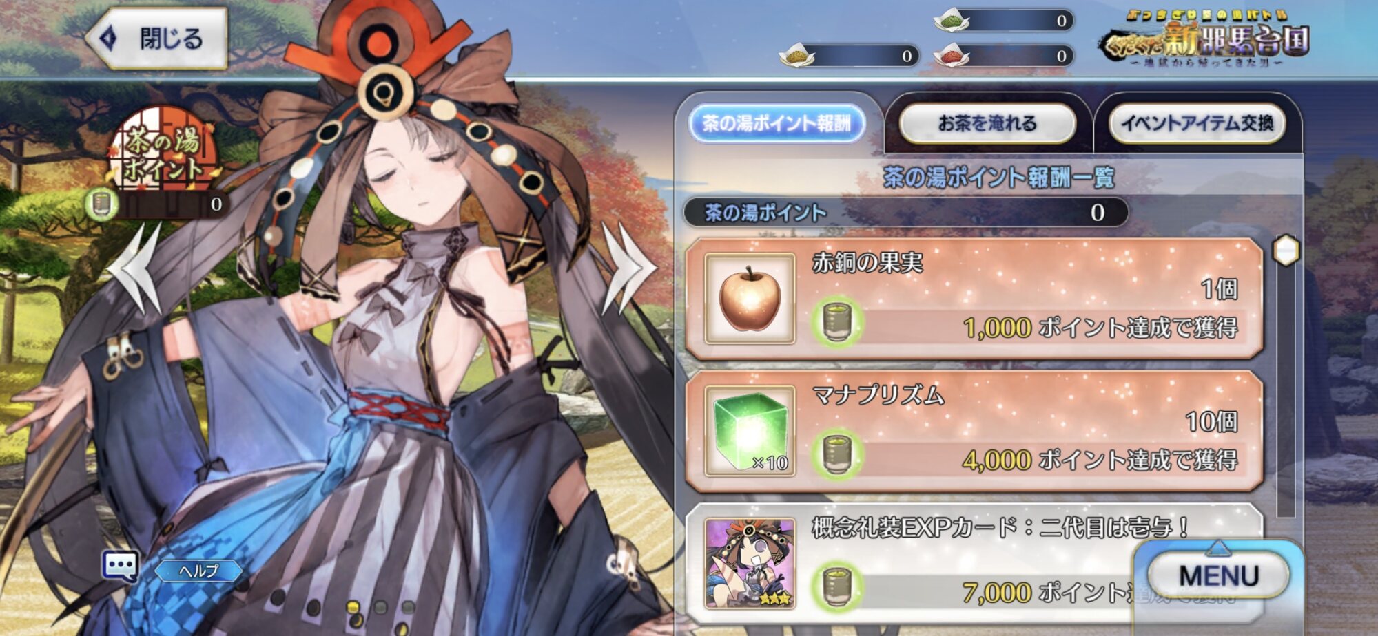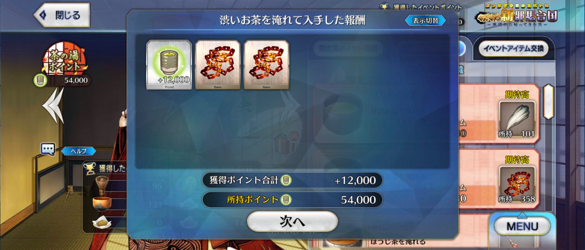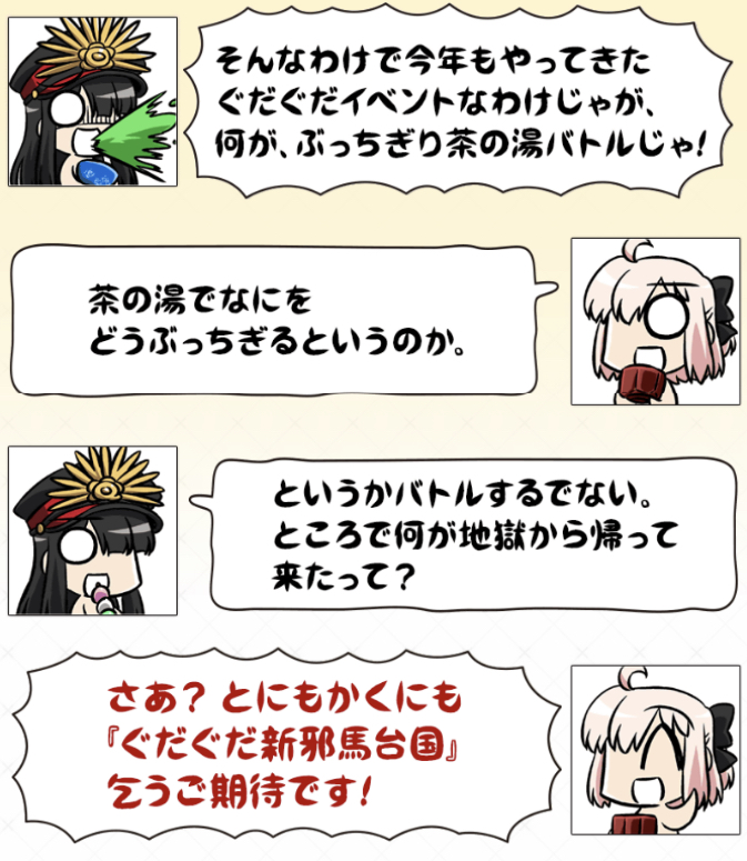 期間限定イベント「ぶっちぎり茶の湯バトル ぐだぐだ新邪馬台国 地獄から帰ってきた男」の専用スレッドです。