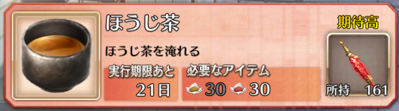 最高効率クエストがどれだけ美味しいのか楽しみで仕方がないとりあえず絆が激ウマなのはおそらくきっと必ず約束されたお茶の大地あとお茶ノブもエネミーで出てきてくれあと利休さんショップにカムバックしてくれあと残るお茶の名前と見た目(交換できる素材の内容はお知らせで公開済みなのでまだ見てないマスターはチェックしたまえよ)しかして山南ィ…お前、あんないい女がいたのに斯様なこと(旧邪馬台国)したんか…