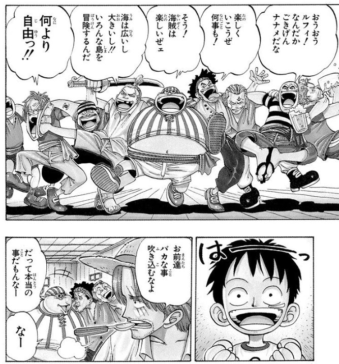 ルフィが出会った初めてで最高の海賊がシャンクス達だから海に出て冒険するならシャンクス達と同じ海賊になった印象。>>938