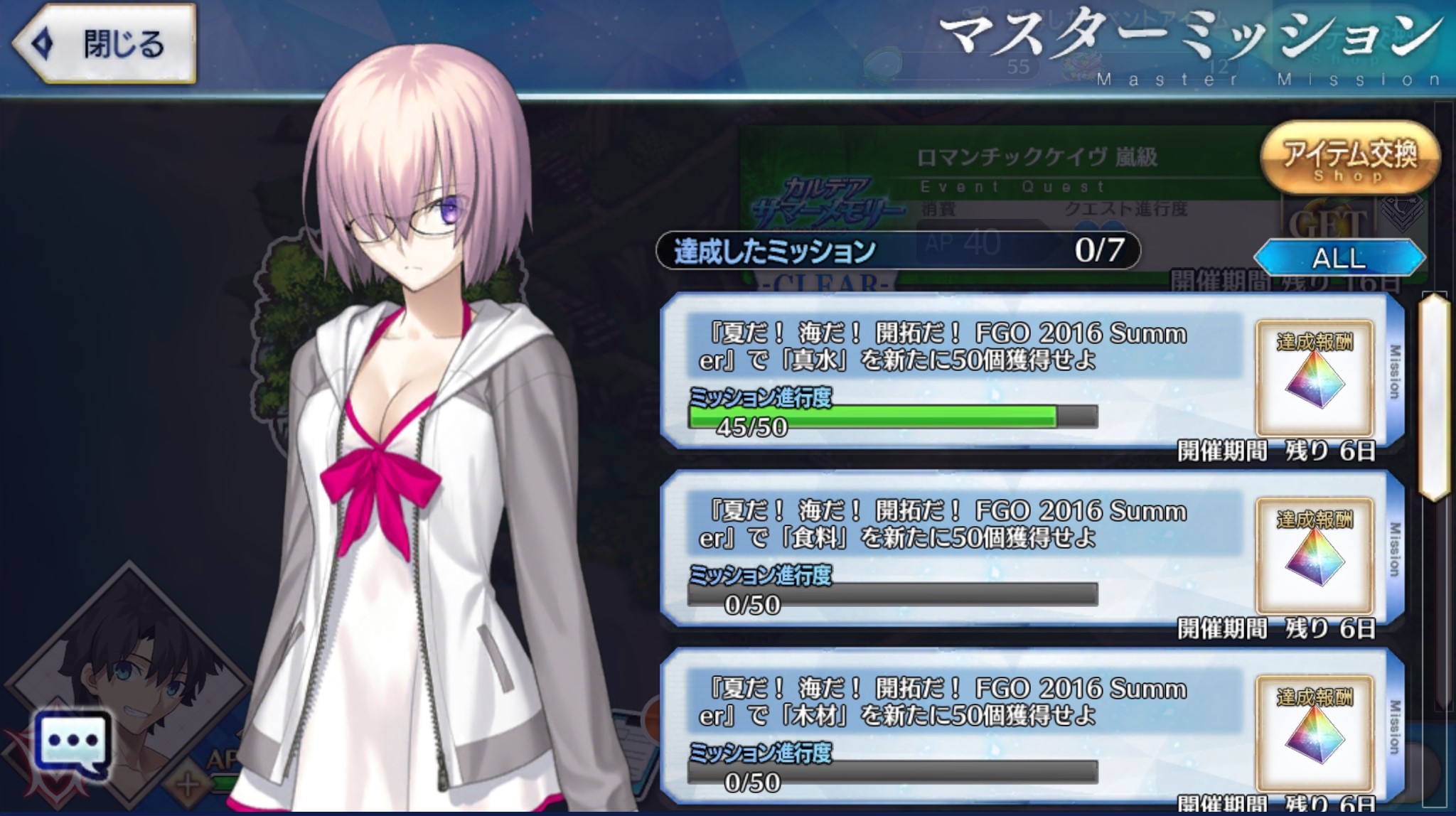 パーカー付き霊衣実装に加えてサマータイム中のミッション画面でもまた着て欲しいもんだわ次は宇宙に行きそうな気がする水着イベント