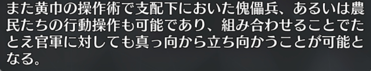 ちらっと調べてみたけど、あまり高貴生まれだったみたいな話はなかったな…ただマテリアルを見たらこういう記述があったので、黒幕側として官軍あるいはこちら側と戦えるくらいの力はありそう張角が官軍側に肩入れするのかなぁ……官軍と戦った側の人だったと思うけど