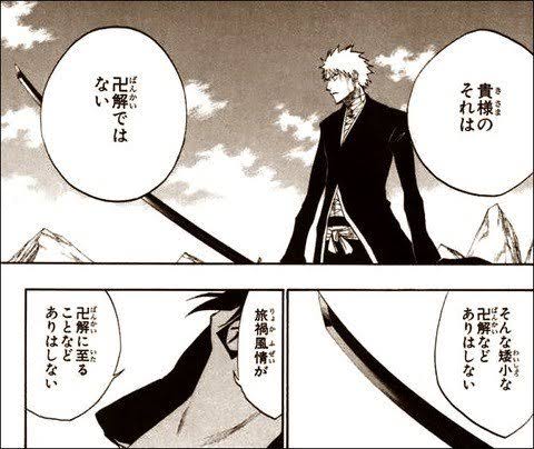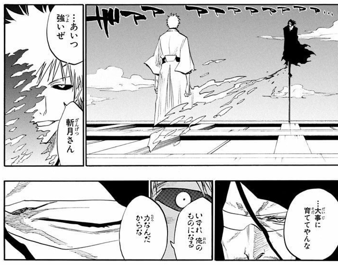 白一護が一護の本当の死神の力だけど、白一護自身はホワイトという虚由来(この虚自体は死神達が材料)の力というのが更にややこしい。月牙天翔という技自体が滅却師の弓矢の応用、更木戦での一護の止血自体が血装の応用と、読めば読む程自分が滅却師だと自白しまくりな斬月のおっさん。