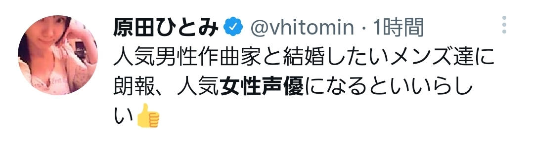 なんかTwitter見たら「女性声優」がトレンドになってて見たら「◯◯(作曲家名)と結婚したいから女性声優になる」「女性声優になったら作曲家と結婚できる」見たいなミームが広がってて原田ひとみさんがまた胡乱なこと口走ってたわ(