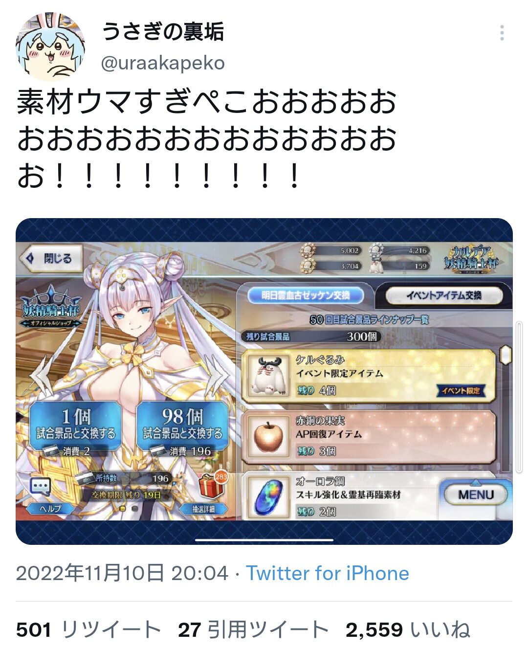 この間のガチャの時にはほとんど林檎無くなってたから間違いなく虹林檎齧ってるw刃物