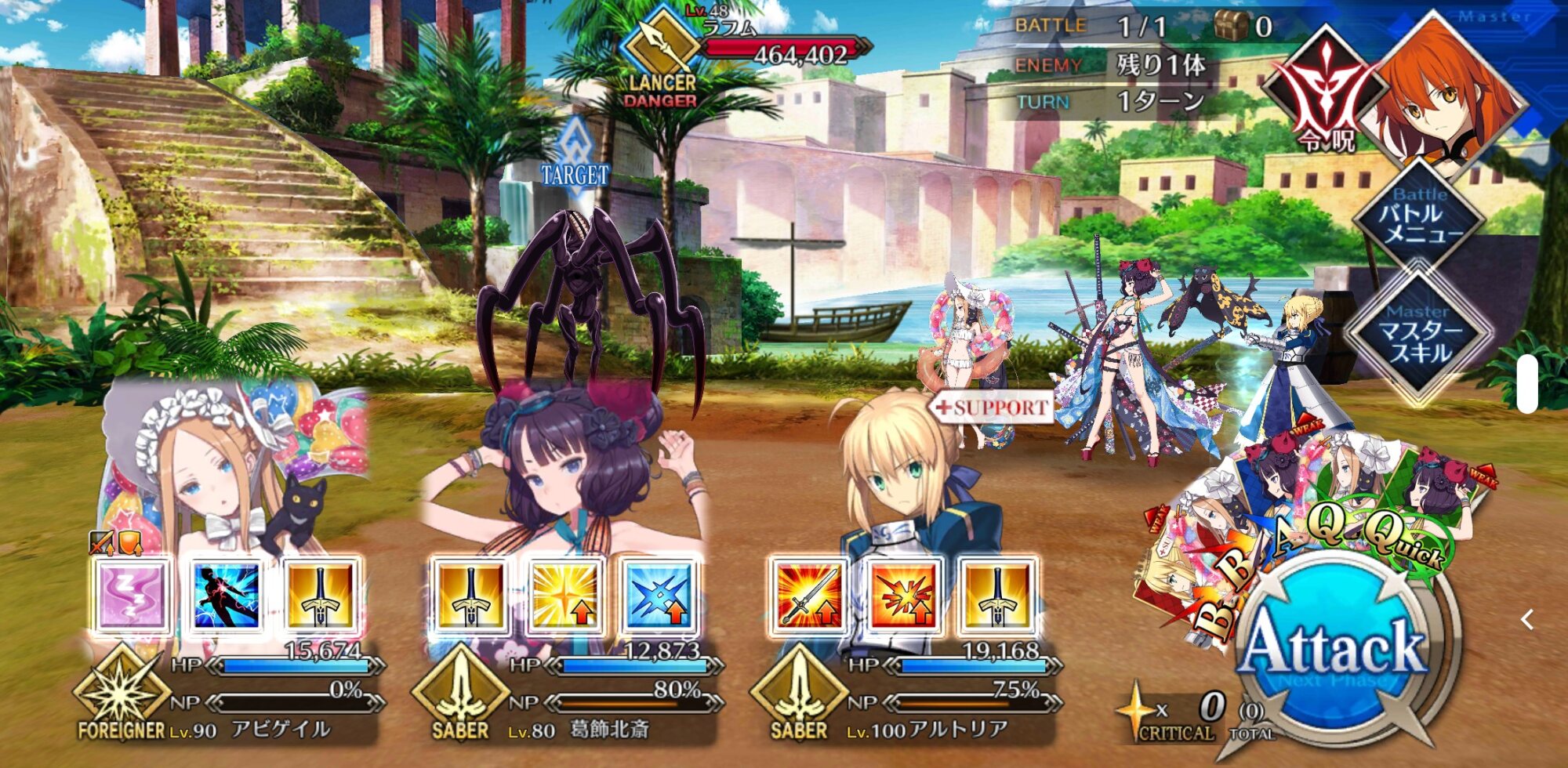 武蔵ちゃんは来たら宝具重ねたいなぁ。クリティカルやスキル1の効果ですぐNP100になるから宝具重ねて恩恵さらに感じたい。ギャスターリソポ
