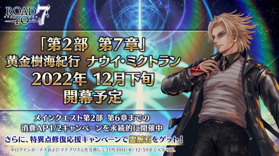 12月下旬に2部7章開幕、12月24日にウィンターパーティーイベント放送があること考えたら、28日に開幕しそう。メインクエストは2部1章、2部3.5章大奥だけが、リアルイベントに伴う生放送だったので、いつもの定例として考えると24日には開幕はなさそう