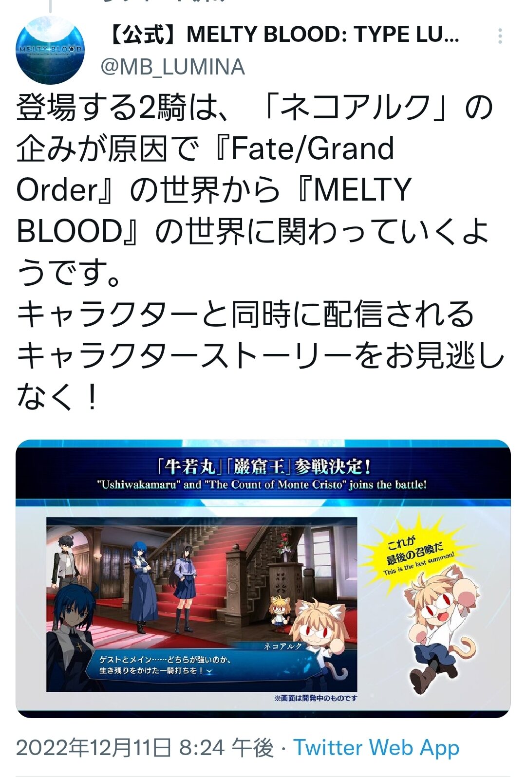 た一昨日のカワグチ版バビロニアで酔っ払って登場したかと思えばメルブラに参戦決定した牛若