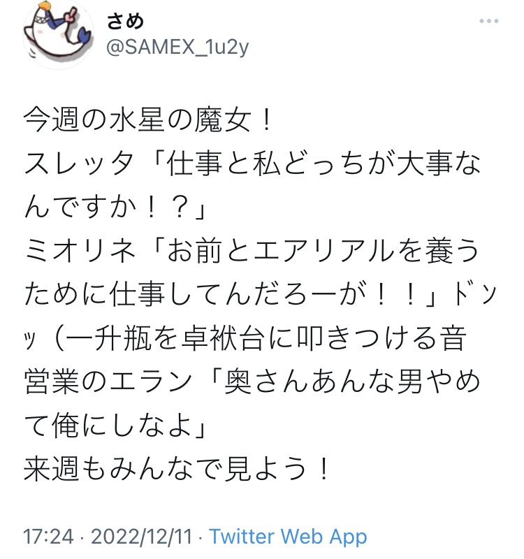 いやあ、これはダブスタくそ親父の娘ですわ。親父そっくりの悪いとこが出ましたねミオリネちゃん・・・