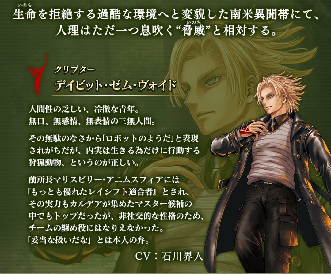 キリシュタリアとサシで殴り合う朕は凄かったですしかしマヤの地下冥界が舞台で死に拘りのある存在となると、デイビットのサーヴァントはア・プチで確定かな