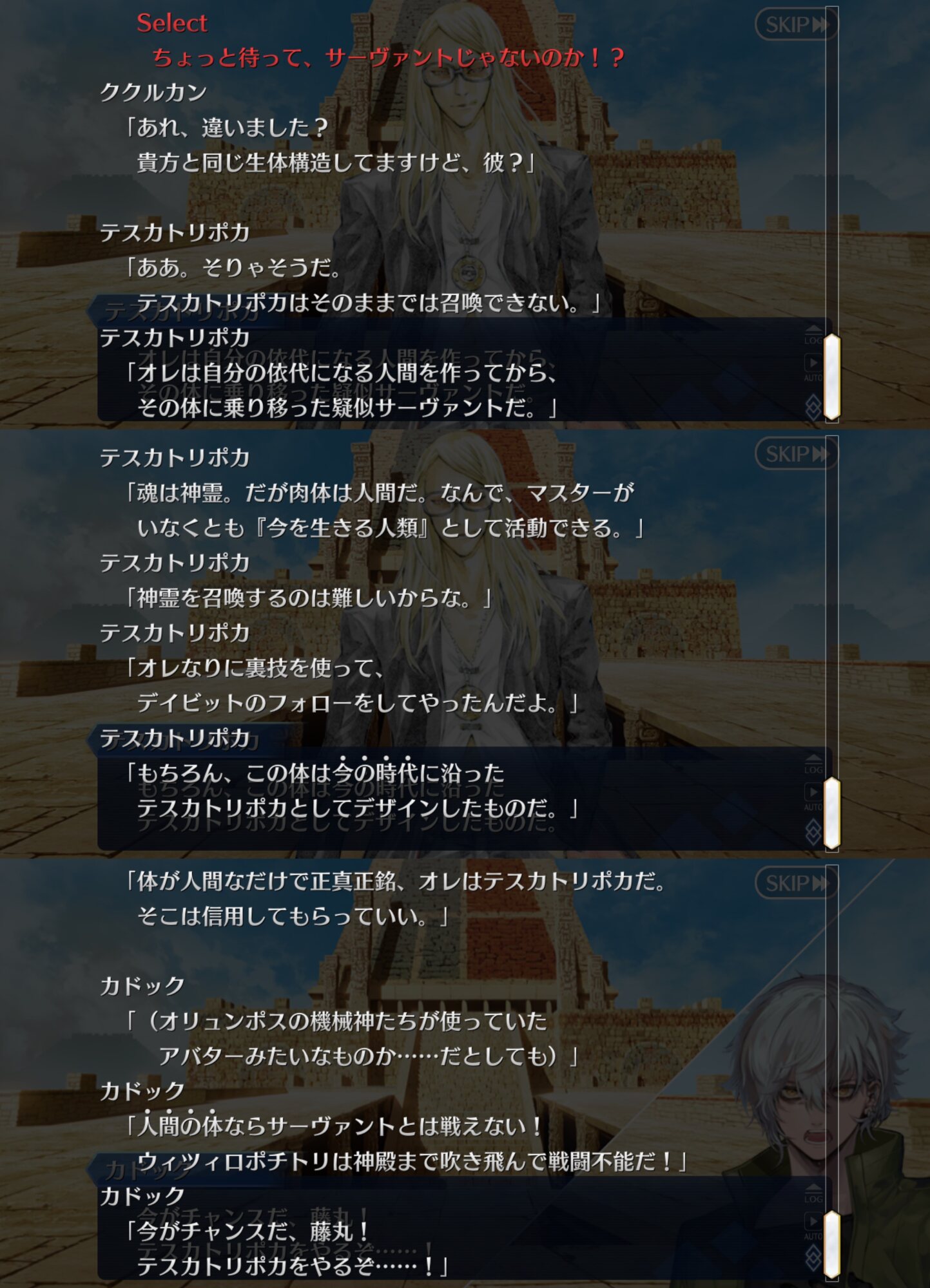 仮にそうだとすると『白』はククルカンと混ざったんじゃないかな?ククルカンはケツァルコアトルと混ざっているなら『テスカトリポカの汎人類史を学習した発言』『主人公のことを知っているような態度』『ケツァルコアトルの面影を持っている』ことに説明がつく