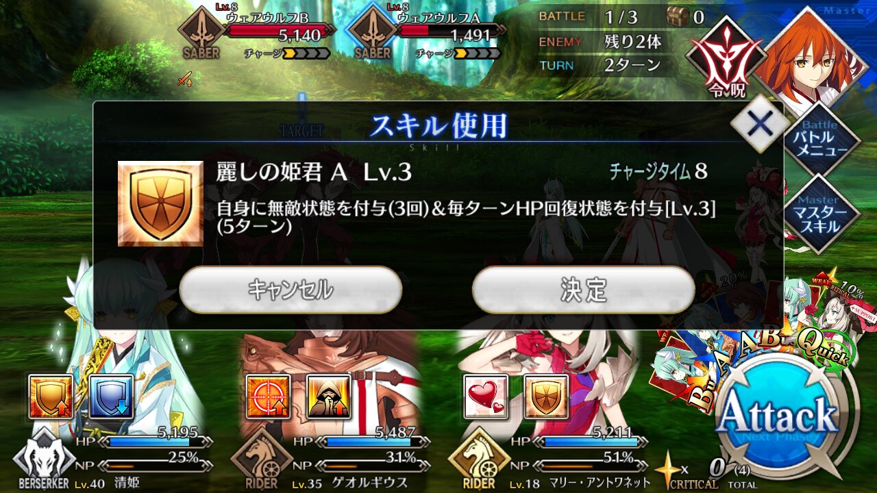 LA無敵とチャージ増加妨害セットのおかげでターンが無駄にならないのほんと偉い監獄塔でファントムの宝具効果をうっかり忘れてくらった人もいるとかいないとか