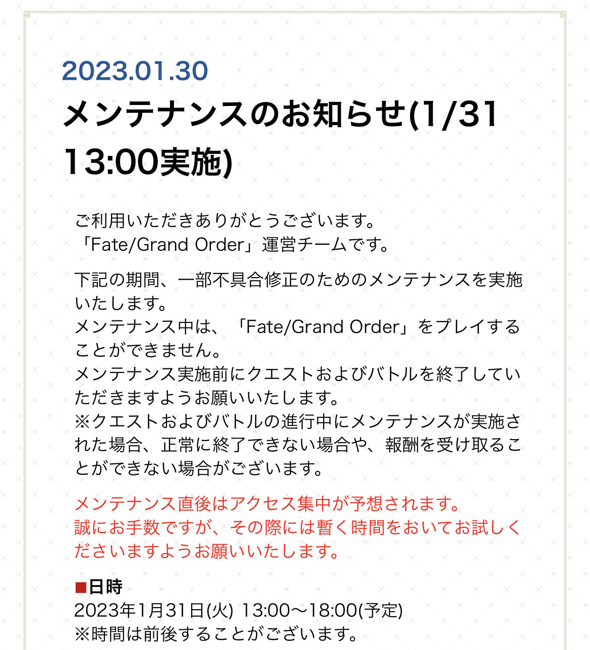 R18関連話題、よくてよ無しのガチャ結果、実装から二週間以内のシナリオ及び開催期間中のイベント内容、進行度依存の報酬、最終再臨や霊衣解放の画像や話題は専用スレにてお願いします。