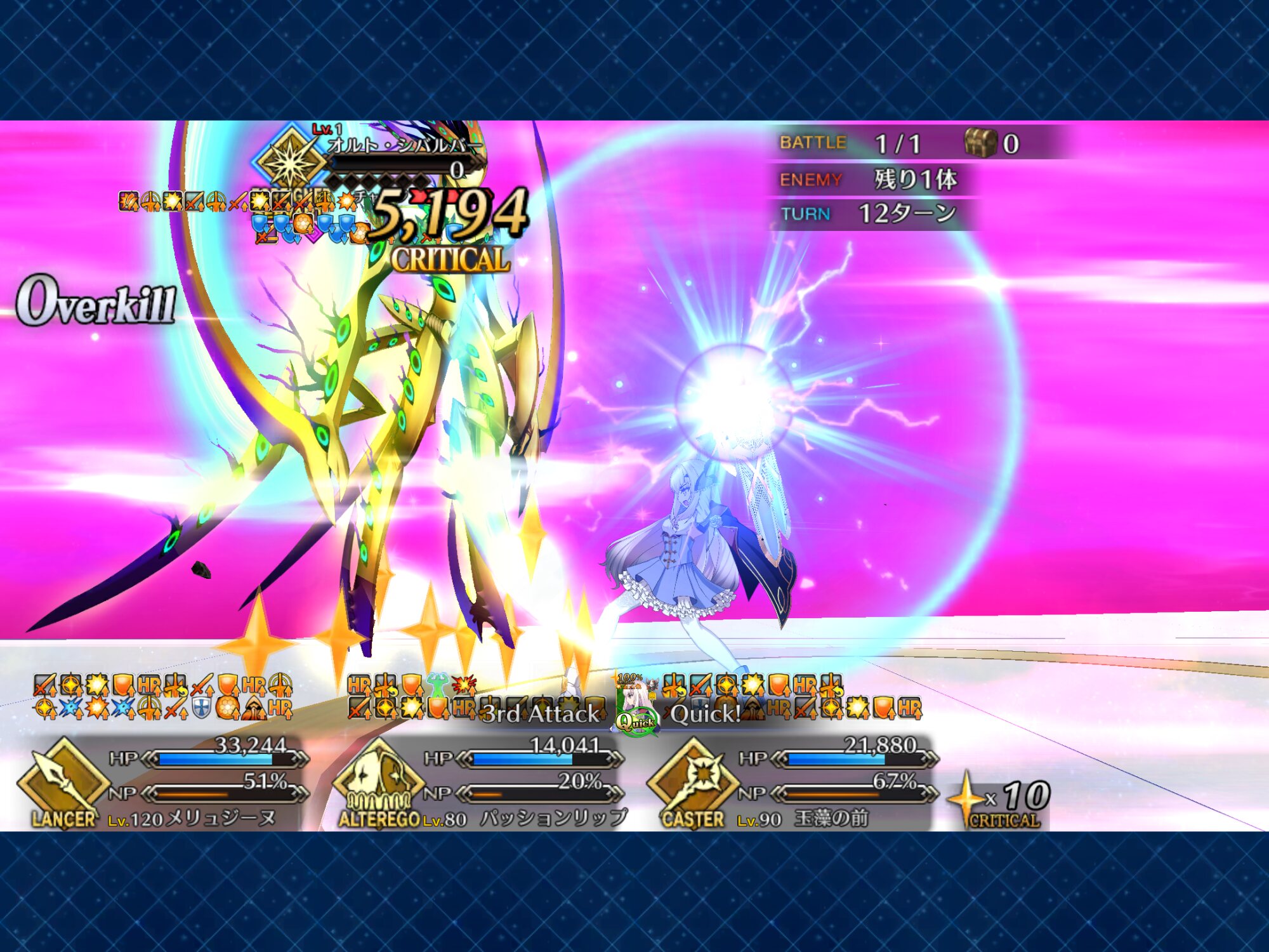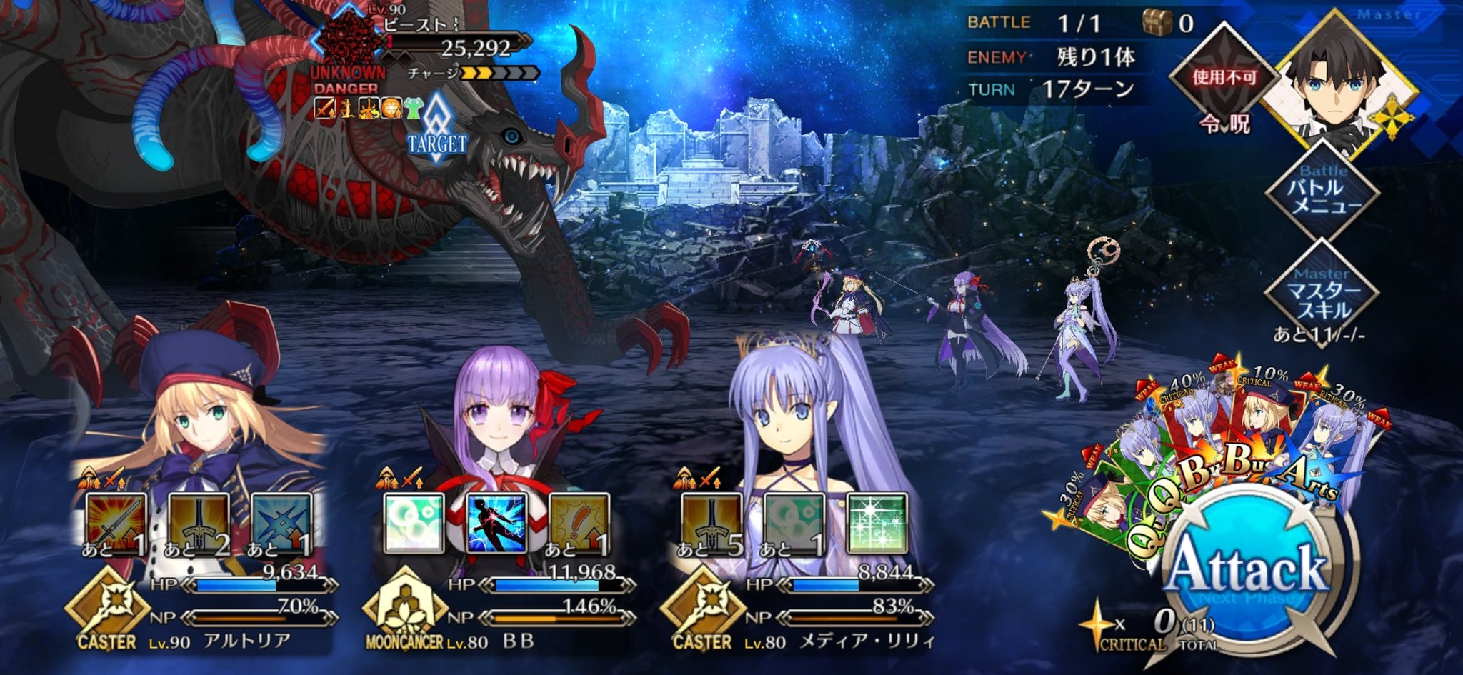 メリュジーヌ、キャストリア、玉藻が前衛でマシュ、リップ、オベロンを控えに置いて挑んだら意外と耐えれた。