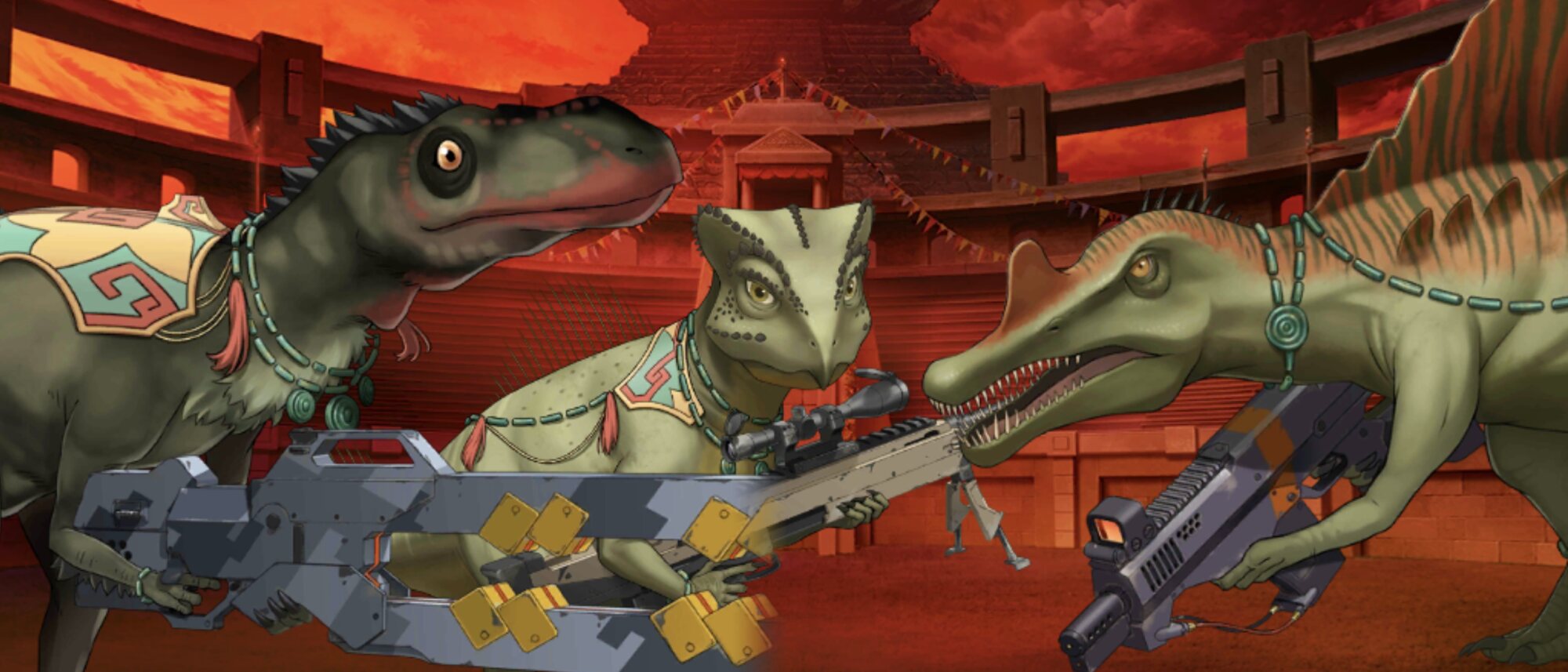 もうなんかいろんな意味でバグるなこの絵面……コラ画像に見えてきた……銃を持った恐竜が宇宙人と戦うって字面だけ見るとB級映画臭がすごいなってふと思った