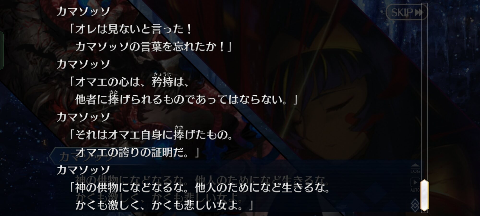 その後の後悔の無い顔良いよね・・・プロフィールに書かれてた願いを今度は果たせたんだってイスカリ、生前がアレだから卑下してるけど実際にはオセロトルに慕われてたんじゃないかなあ…。