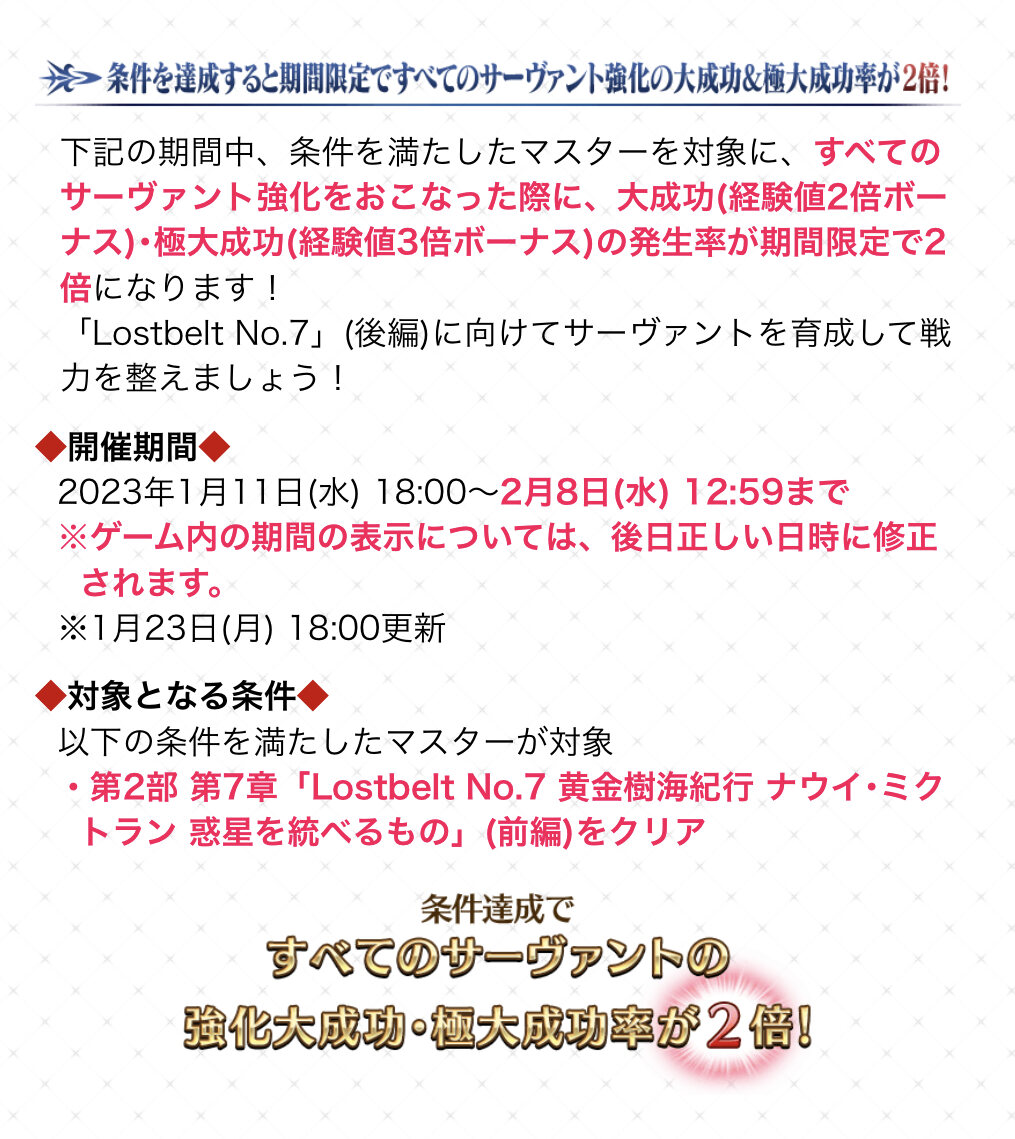 強化大成功確率2倍なのは明日の昼までなので、サーヴァント引けたよって方はお早めに