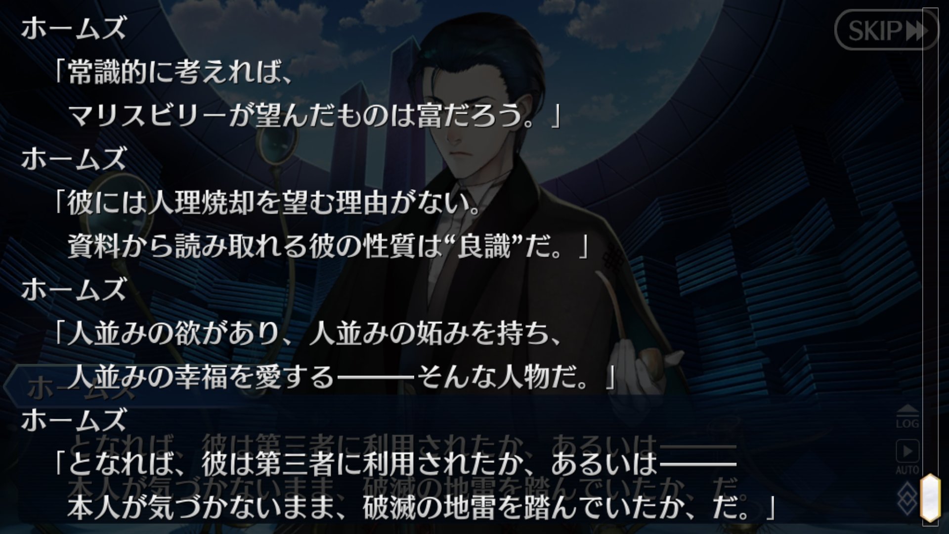 そのカルデアを「都合のよい観測者」に仕立て上げるのがホームズの役割じゃないかな。だからこそトラオムではそうならないように自害したんだろうし、「カルデアが異聞帯攻略する」こと自体は異星の計画に含まれてるみたいだし。