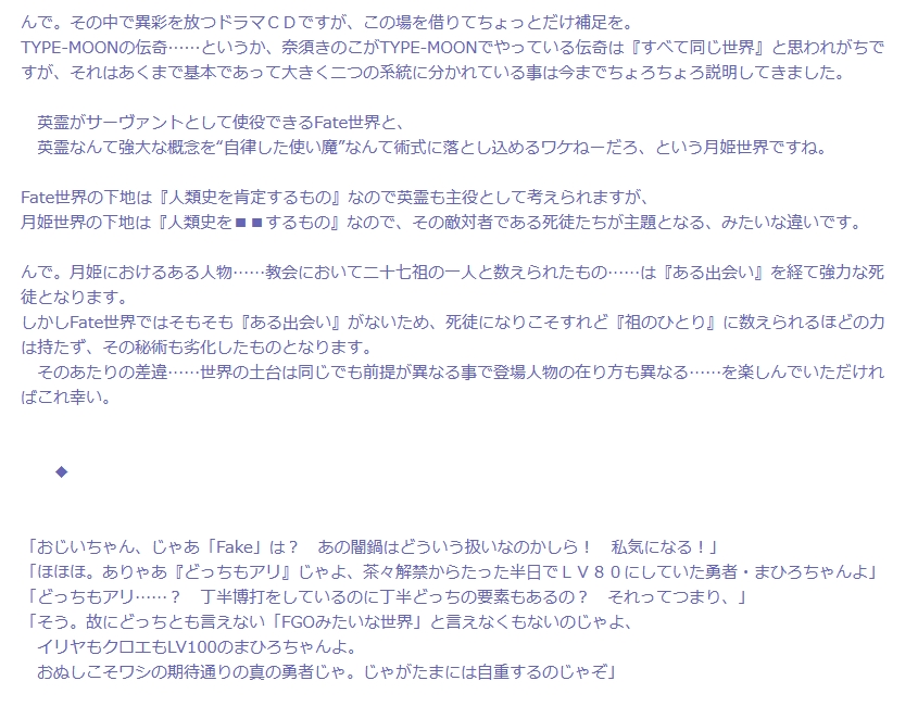 直死と無には関連性がありそうな感じはあるし、なんてかソロモンのアルス・ノヴァしたわりに痕跡残っているとか、カルデアの者の責務(タスク)?自体にもそこら絡んでいそうで……ポケモンSVでイーブイ厳選しまくって疲れた頭がふと思いついた節穴だらけの考察。