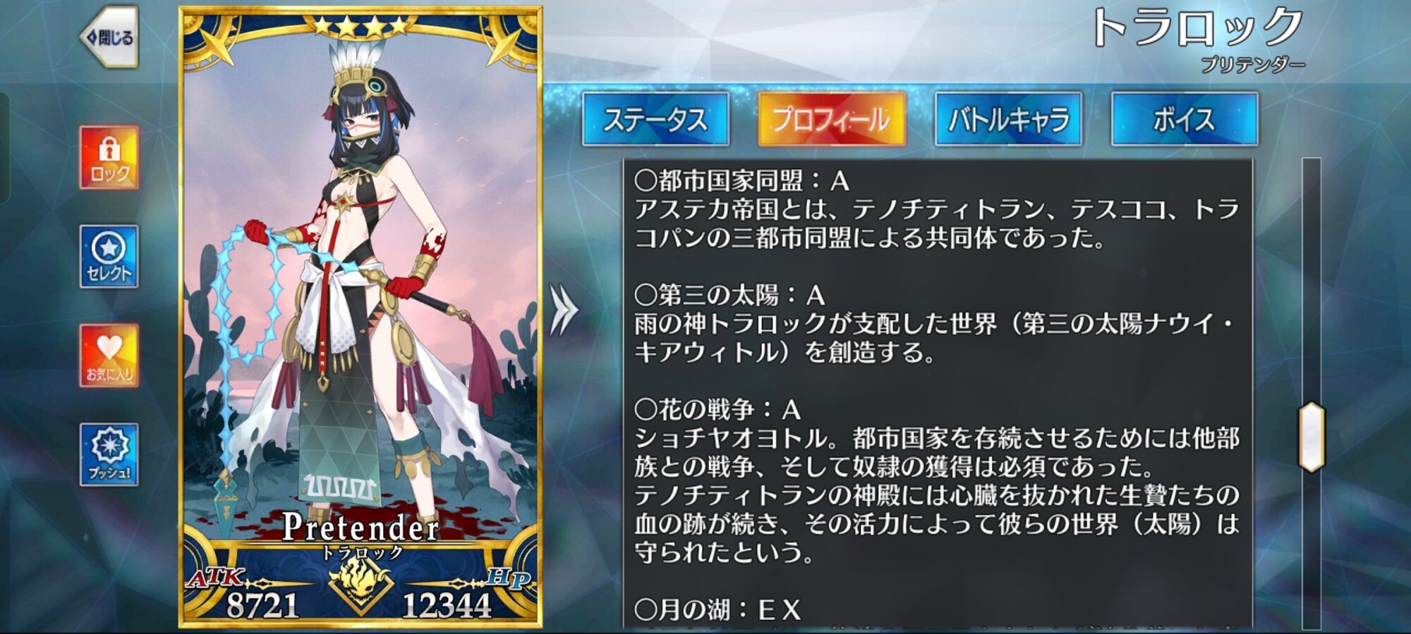 テノチティトランの素のステータスがやけに低いのは、神秘とは対極に位置する"人の営み、文明"を象徴するサーヴァントであるからだが、同時に宗教を成立させる"神殿、信者、土地"を内包するが故に..."神秘を行使する場"としての高い適性を持つ為に神々の能力を行使できるのだろう。