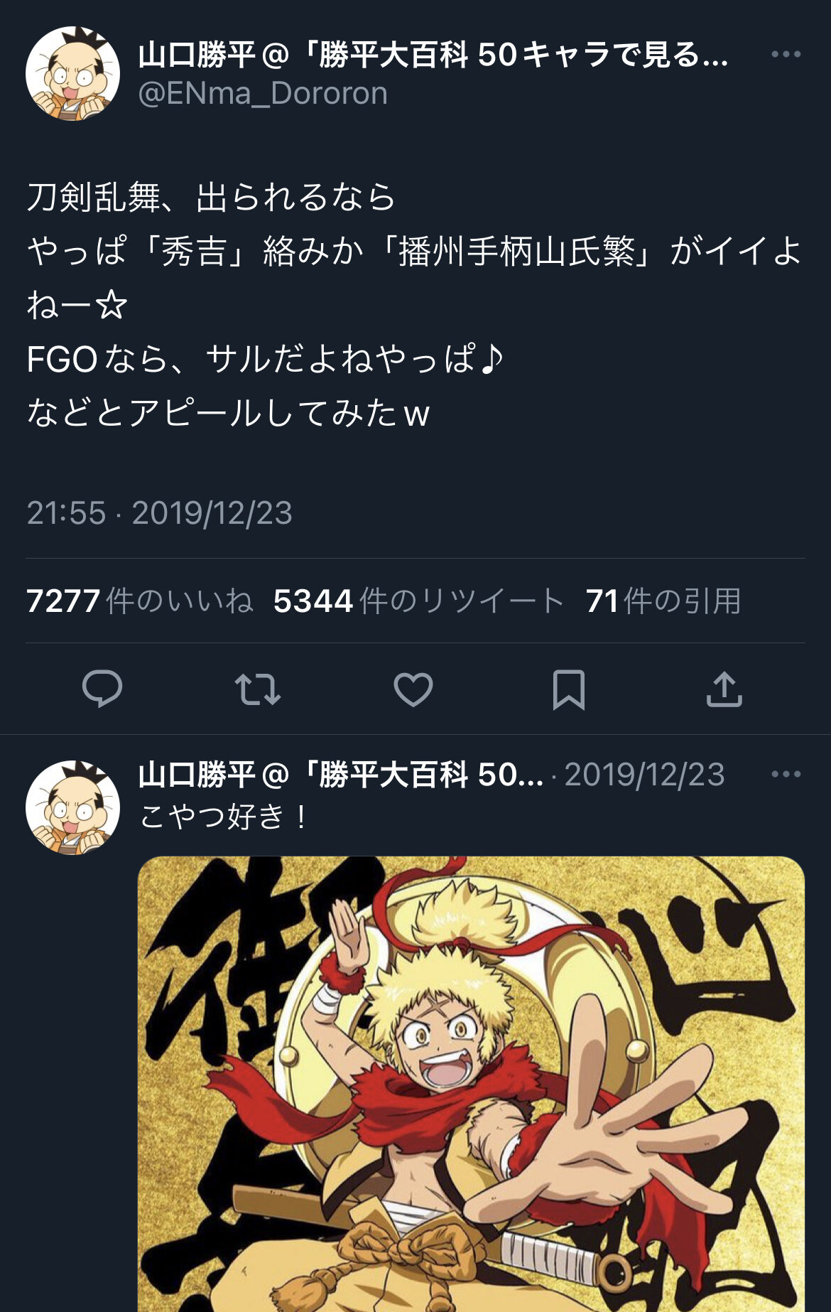 勝平さんがやりたい!ってアピールしてたけど、実際に秀吉実装ないし声が付くとなると誰になるか…>>41
