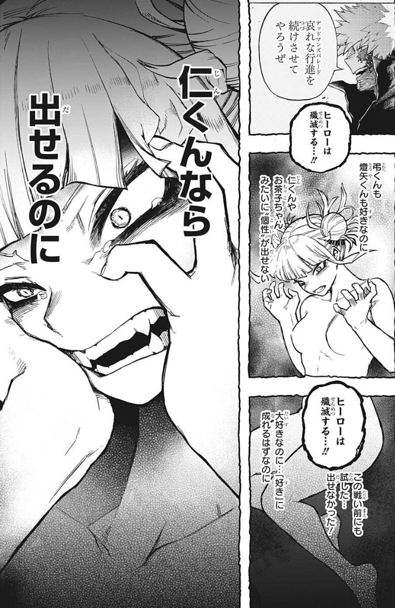きれいごと言ってられる相手でも無し、しゃーなしやトガちゃんの個性もデメリットは存在したんだな。今のトガちゃんはトゥワイスになってるけど心そのものはトガちゃんだからってことよね。