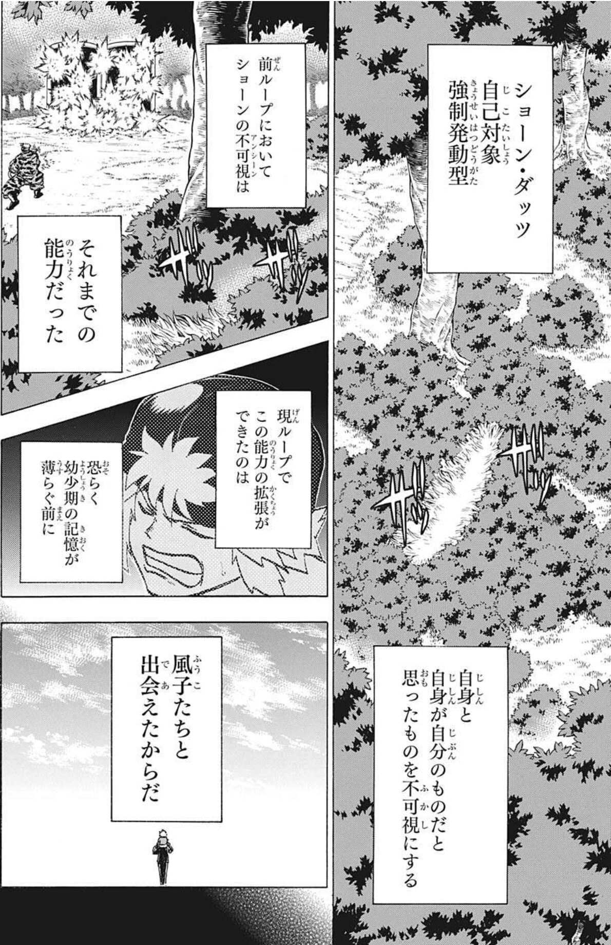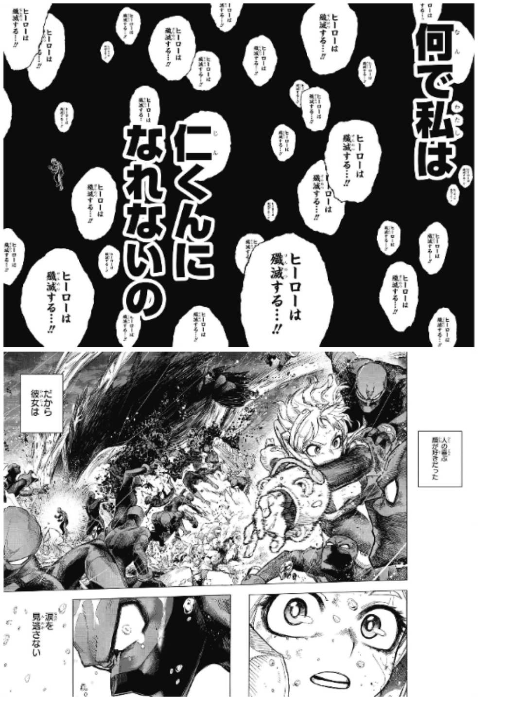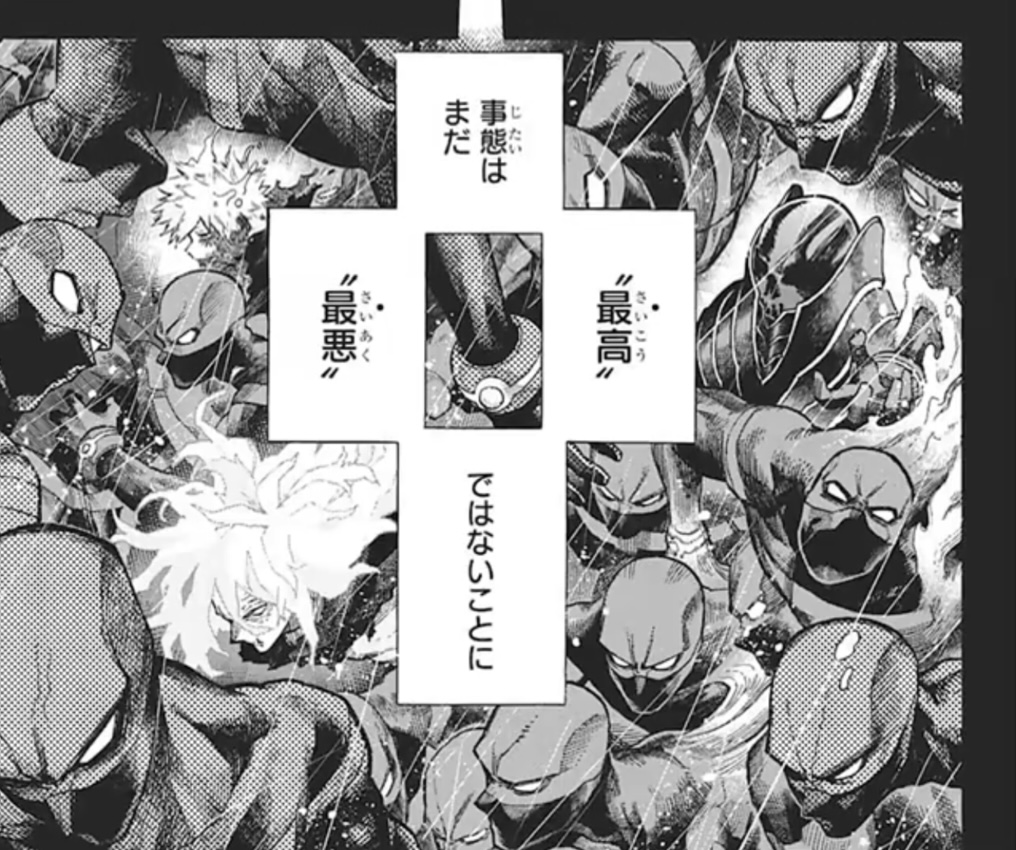 次の見開きでもトゥワイス状態のトガちゃんが同じ位置に描かれてる演出良いよね……俺も好き超常解放戦線時はまだヒーロー側がマキアの細かい情報を把握してないほぼ初見に等しい状態だったから為す術もなかったけど、今だとそうか