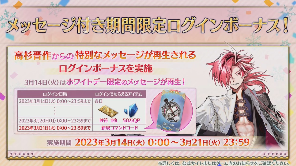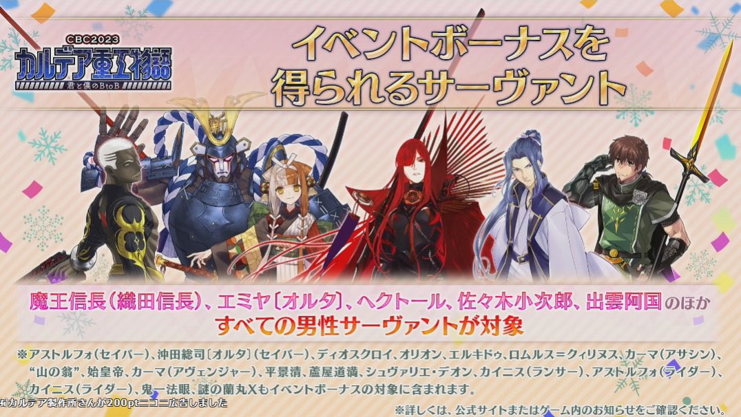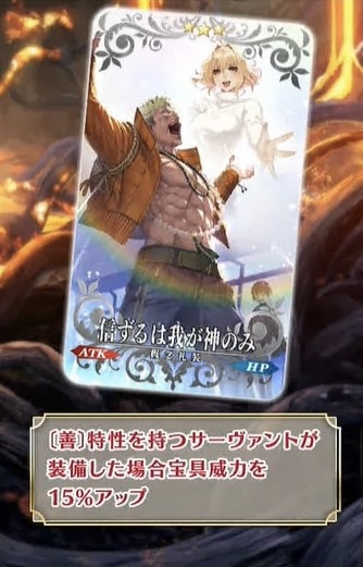 どっかで「二次創作チェックしてます」的なこと話してて、その直後くらいに怪盗天草きたから、マジで「このキャラには人とか金を動かす力がありますよ」って態度で示すの大事だと思うホワイトデー関係は天草(アポクリファ鯖、後に霊衣獲得)、アーサー(プロトタイプ鯖)、アラフィフ(実装済み、霊衣獲得)、