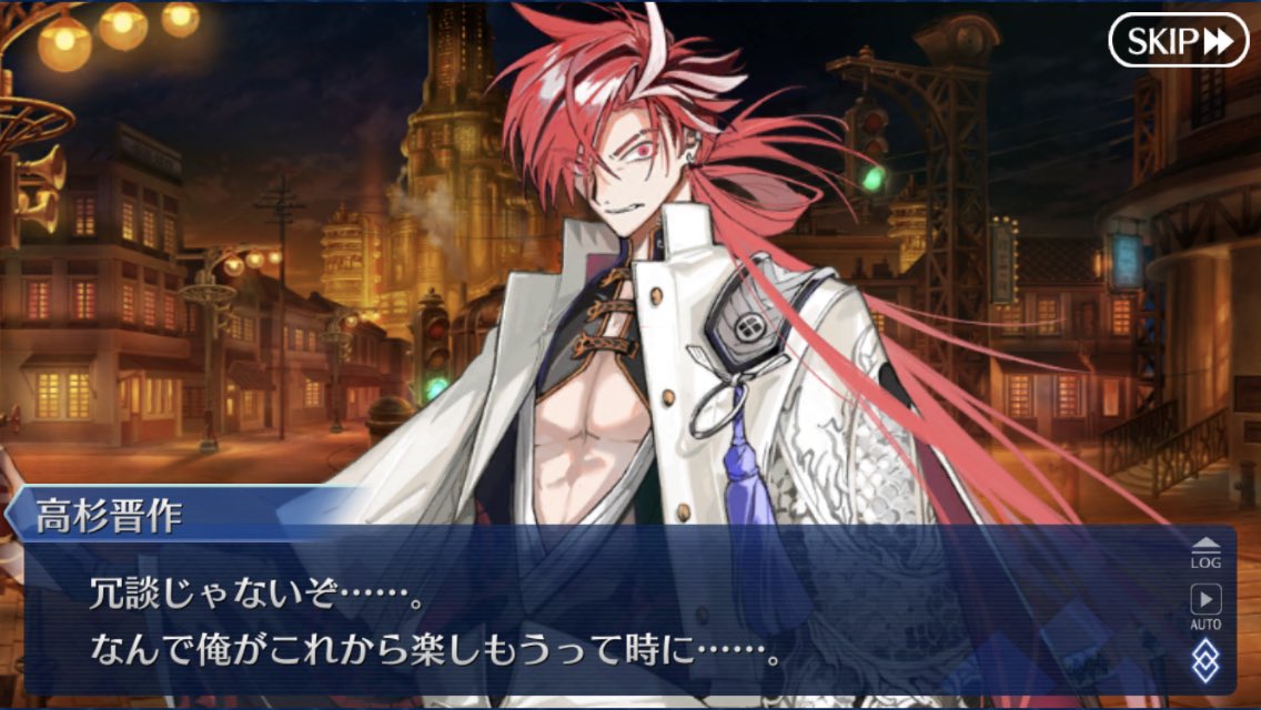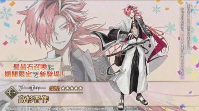 「あんたぐだぐだ鯖やろ何3月に実装されとんじゃい!!」と思いながら天に拳掲げ我が生涯に一片の悔い無し。どうしよう秋頃だと思って石まだ溜まってないけど引く意思は天井突破してるから大丈夫!! 絶対引いてみせるわ高杉さん!!!!!!