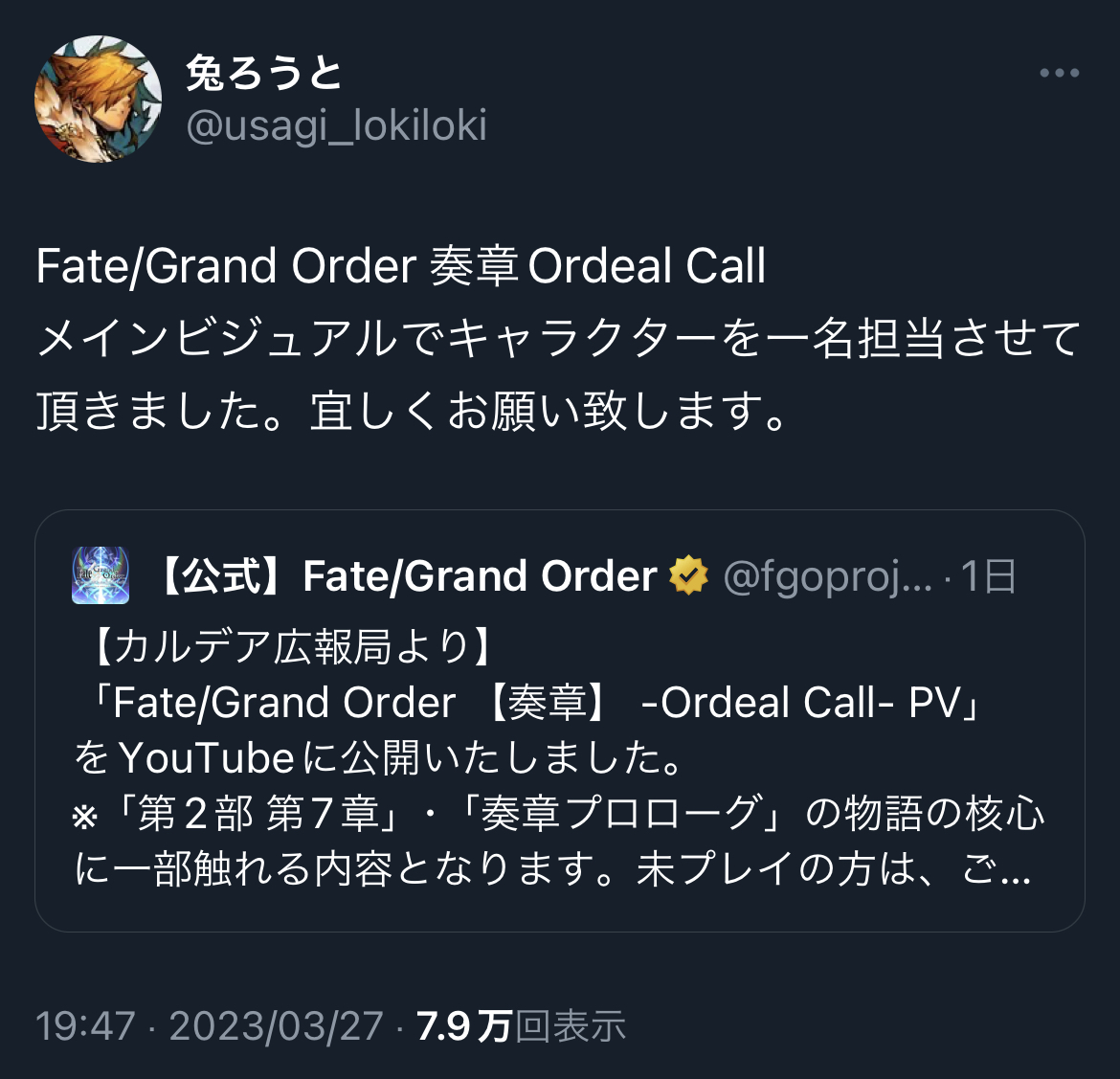 同級生がやっててすごい熱く語ってて興味持ったからですわあFGOでは数々の作品からの要素や小ネタ裏設定が集まり開示されていてそういうのも魅力ですよね。しかし、きのこ回りの供給だけでなくKateさんによる原典Fateからのアレンジ楽曲や新曲の供給もありがたいなあって思います。
