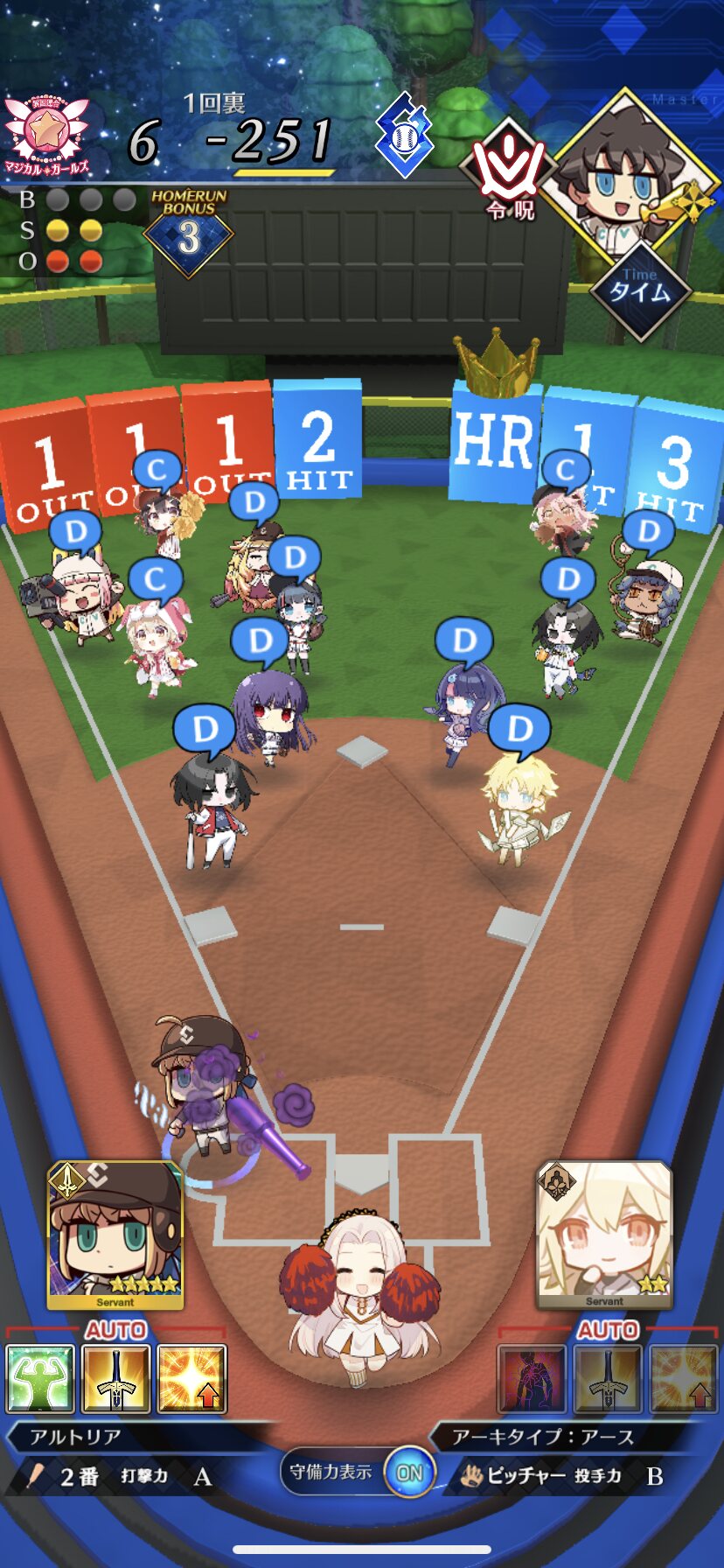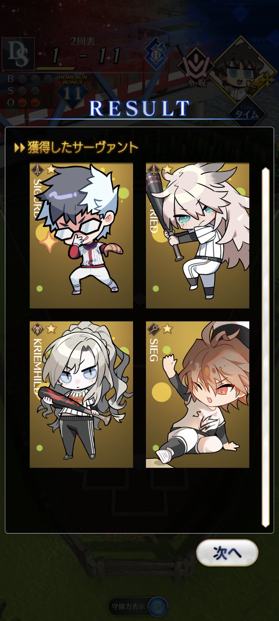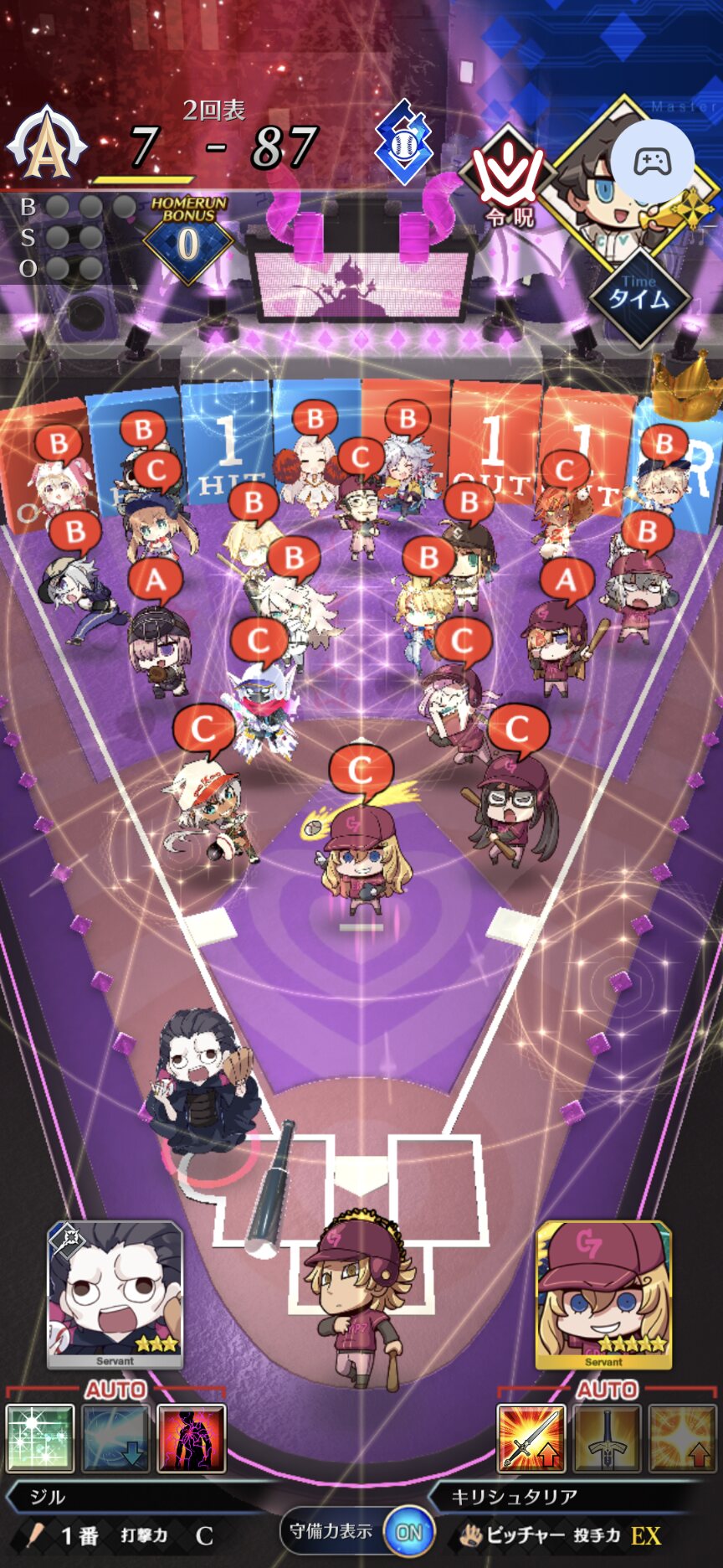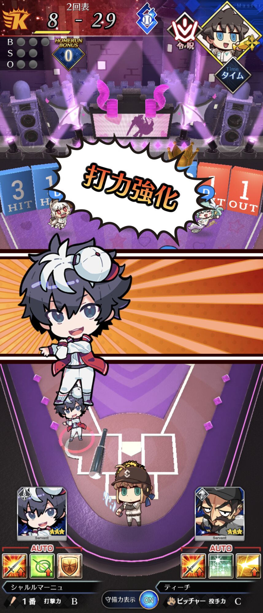 記憶が合っていれば「試合中吹っ飛ばした相手サーヴァントを獲得」やでここ数年やきう見てた影響でバッターに合わせて球種選ぶの楽しすぎるな……