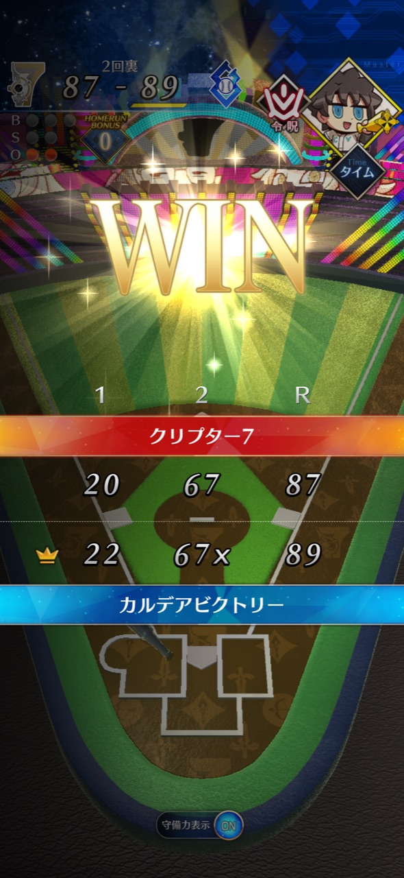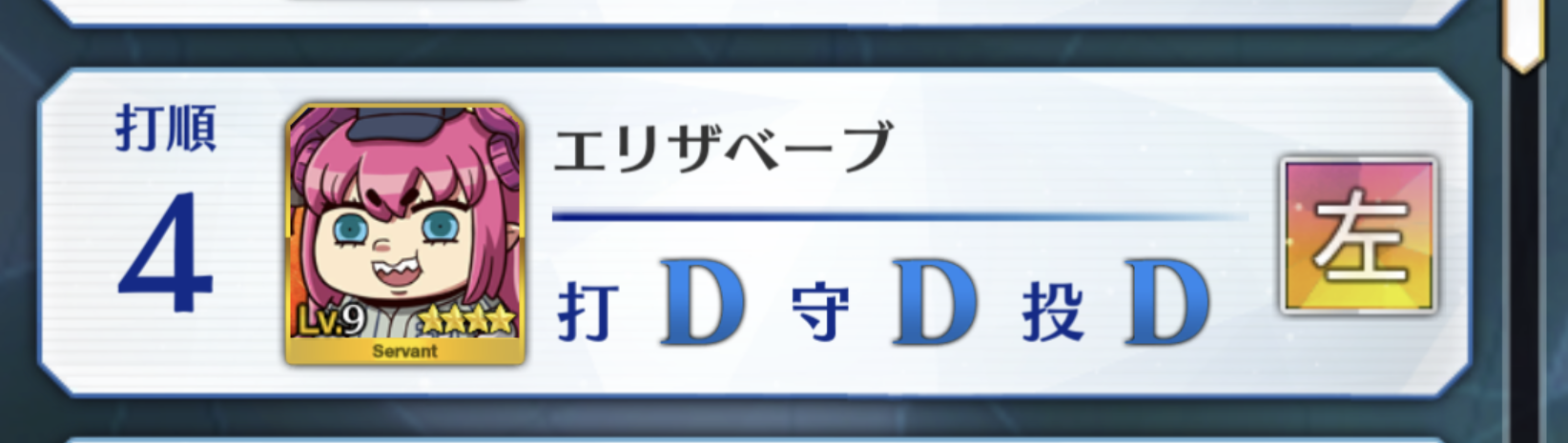アルトリアやプロテアちゃんなどの天性のスラッガー持ちと組み合わせて大得点をねらおう!セイバーさんは最強だからとりあえず入れて打順を回そうって感じやな。