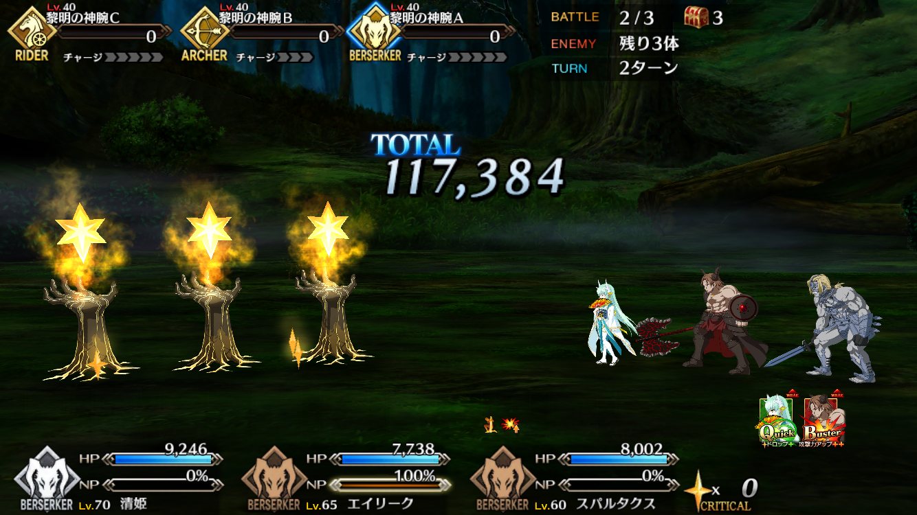 次の銅狂は誰かねぇ。伯父上の宝具強化とかだろうか?(金殺は十中八九ヒロインXのスキル強化だろうと思われるが……?)クイックチェインは今選択したカードのクリティカル率+30%とかなら普通に使うが