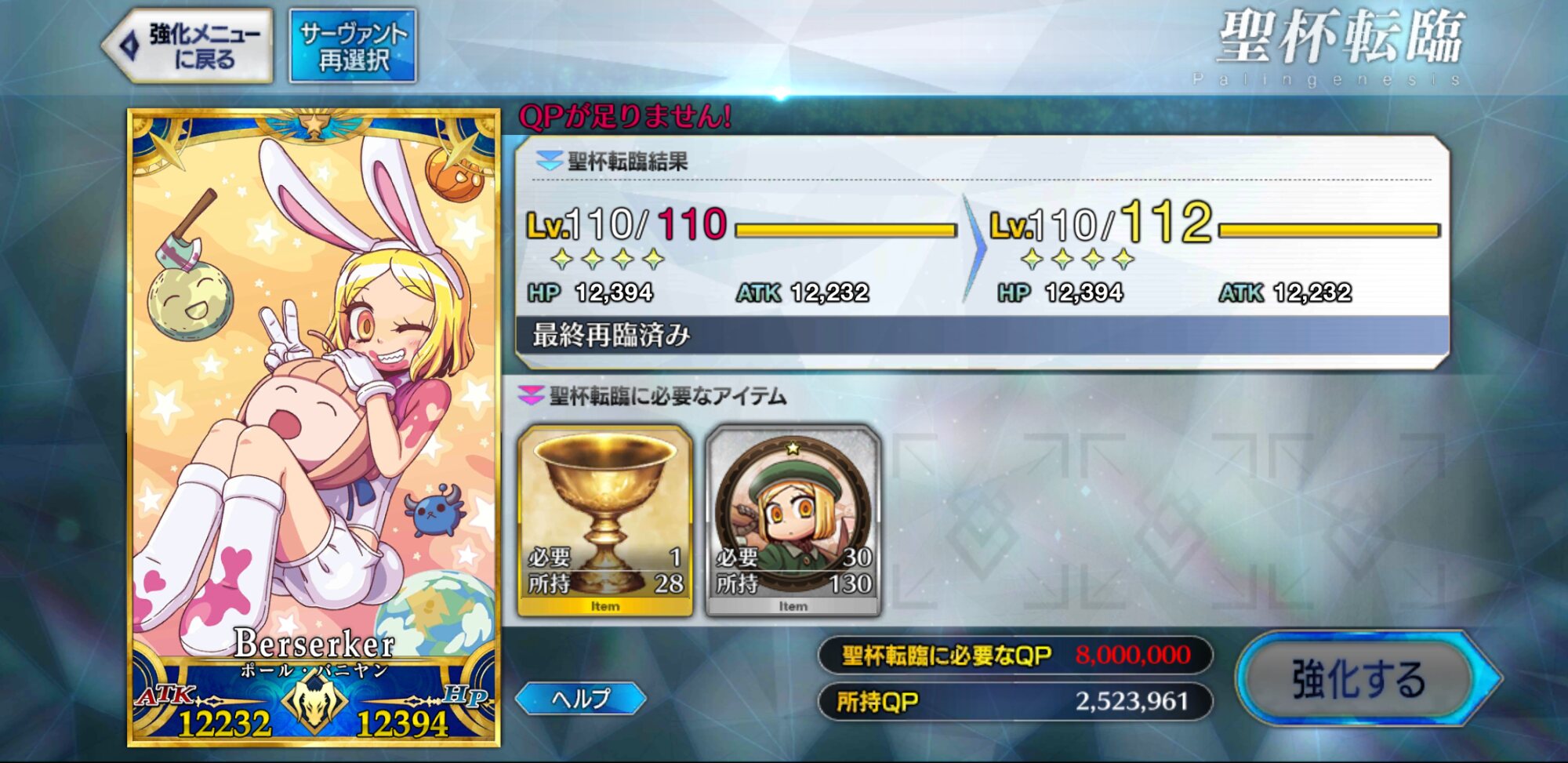 それに加えてQPと交換可能な再臨素材を交換するのもありかもしれませんねぇ何気に今回のメインクエ報酬は終局までだから、まだ1.5部と2部の分が残ってて